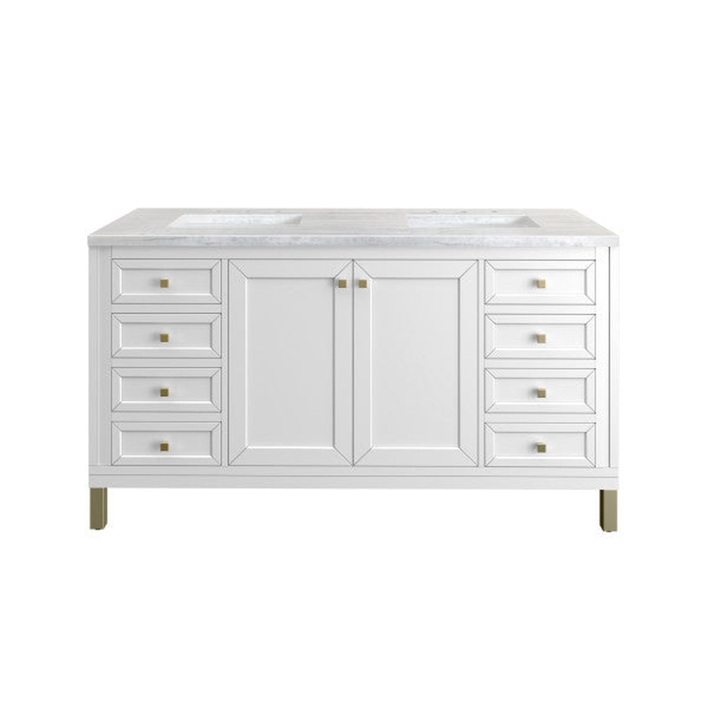 The Chicago collection's sophisticated, subtle details and clean lines make this the perfect choice for any bathroom space. Crafted from Poplar solids and plywood, the Chicago 60" Double Vanity is designed for beauty and function, offering ample storage. The two door cabinet features six drawers and one adjustable shelf. The bottom drawers are double height and the top row drawers are tip-out style. The Glossy White finish, paired with the Arctic Fall solid surface top, creates a dramatic statement. The Champagne Brass finish on the legs, and decorative knobs add a contemporary touch. Choose to forego the metal legs for a modern wall-mounted option.