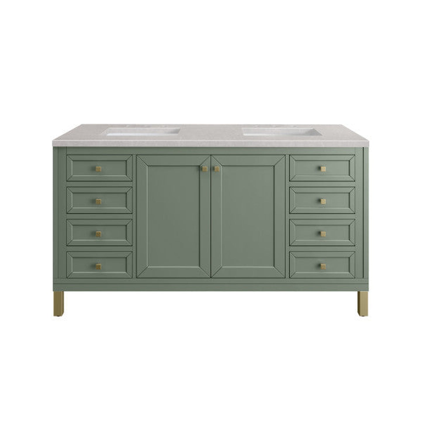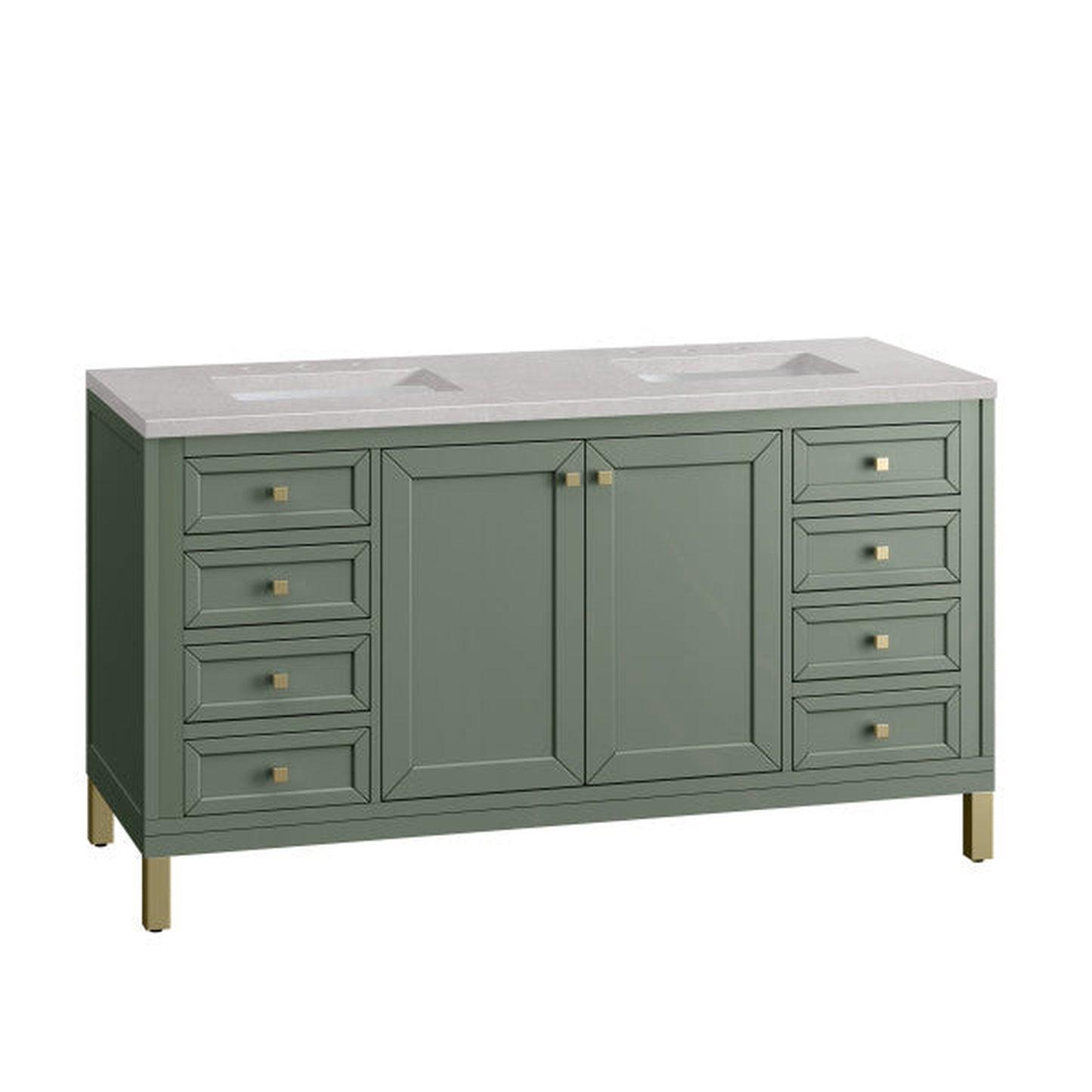 The Chicago collection's sophisticated, subtle details and clean lines make this the perfect choice for any bathroom space. Crafted from Poplar solids and plywood, the Chicago 60" Double Vanity is designed for beauty and function, offering ample storage. The two-door cabinet features six drawers and two adjustable shelves. The bottom drawers are double height, and the top row drawers are tip-out style. The Smokey Celadon finish, paired with the gray surface and white veining of the Eternal Serena Silestone top, creates a soothing environment. The Champagne Brass finish on the legs, and decorative knobs add a contemporary touch. Choose to forego the metal legs for a modern wall-mounted option.