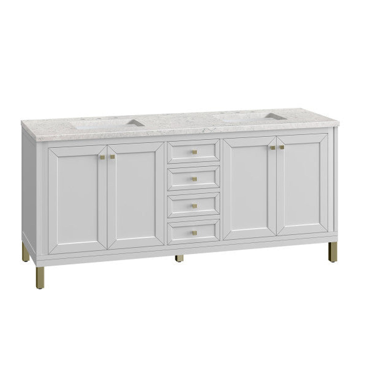 The Chicago collection's sophisticated, subtle details and clean lines make this the perfect choice for any bathroom space. Crafted from Poplar solids and plywood, the Chicago 72" Double Vanity is designed for beauty and function, offering ample storage with four drawers and two sets of double doors opening up to an adjustable shelf. The Glossy White finish, paired with the Eternal Jasmine Pearl top, creates a rich, elegant look. The Champagne Brass finish on the legs, and decorative knobs add a contemporary touch. Choose to forego the metal legs for a modern wall-mounted option.