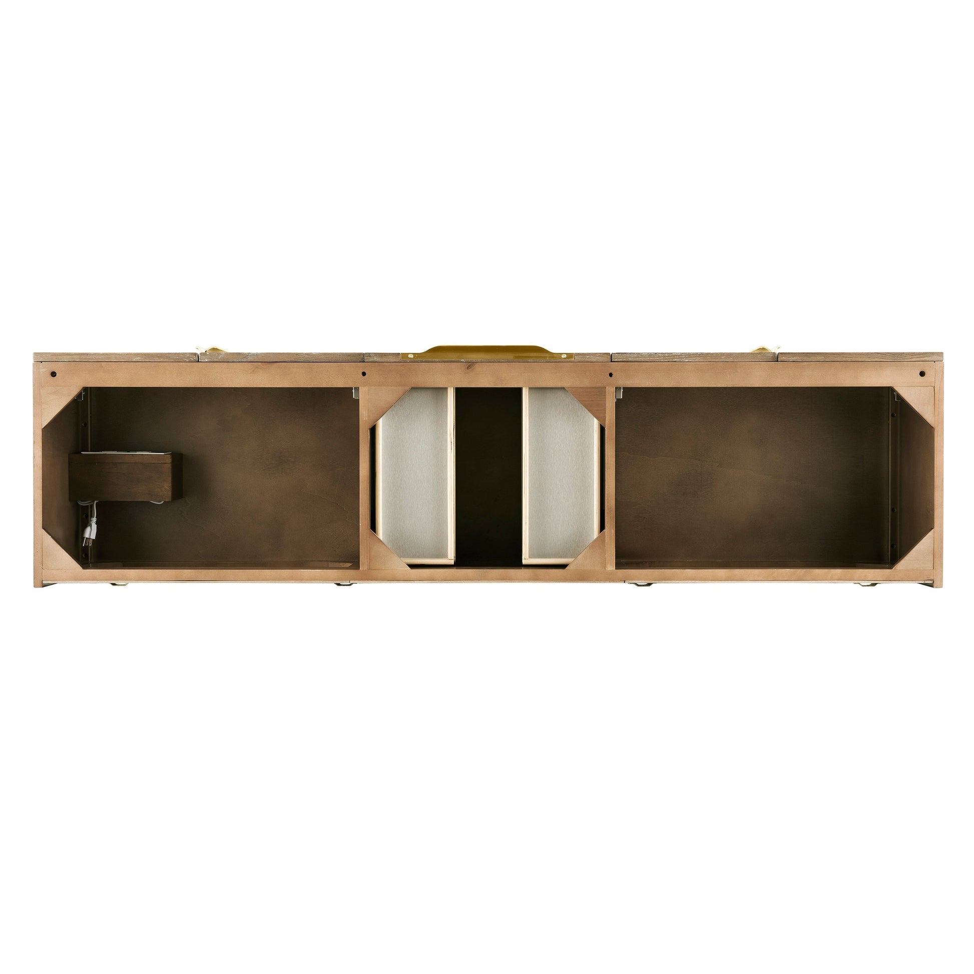 The Columbia 72" Latte Oak vanity offers maximum storage with two soft-closing doors, three soft-closing drawers, and lower shelf space. This cabinet comes with premium features such as one solid bamboo in-drawer organizer and one 120 Volt UL rated electrical component with two electrical and two USB (2.0) outlets. The radiant gold finish base coordinates with the pulls.