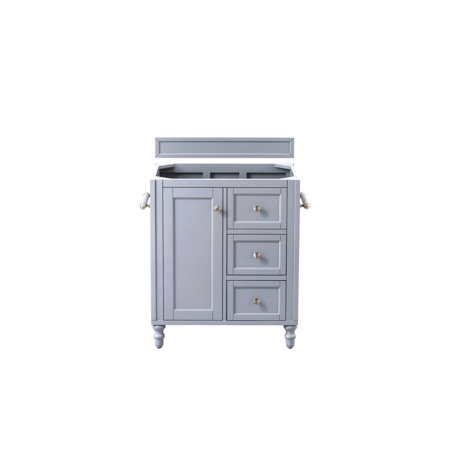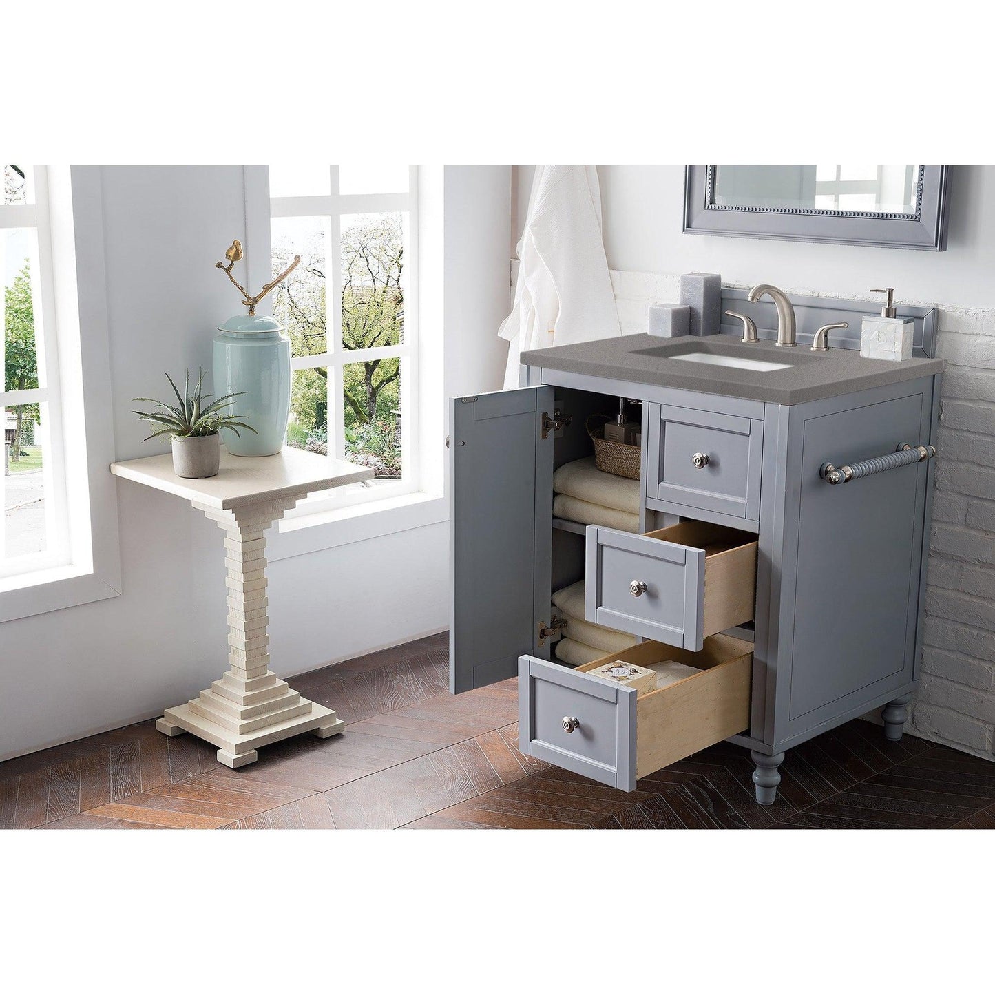 The Copper Cove Encore 30" Silver Gray Vanity by James Martin Vanities features optional towel bars, a bamboo drawer organizer, and interior shelf space. This cabinet also includes a decorative wood backsplash. The look is completed with a 3cm eased edge Gray Expo Quartz top with a white solid surface rectangular sink.