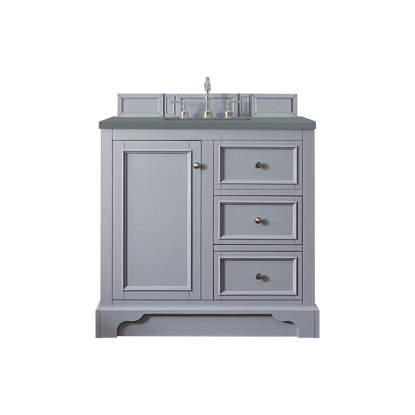 - The De Soto 36" Silver Gray single vanity was designed to fulfill a wide range of tasks. Storage and convenience are foremost in this collection. The De Soto series provides ample storage in each of the six available widths and configurations. Cabinets are crafted from North American birch hardwoods and veneers. Low maintenance is provided with the full plinth base located behind the rounded bracket feet. Premium features in this series include an electrical and USB outlet and beautiful faux-shagreen drawer organizers. Optional wood backsplash included. The look is completed with a 3cm eased edge Cala Blue Quartz top with a white solid surface rectangular sink.