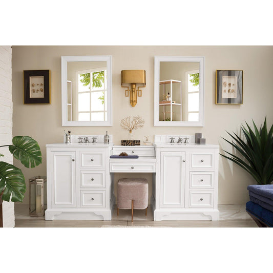 James Martin Vanities De Soto 82" Bright White Double Vanity Set With Makeup Table, 3cm White Zeus Quartz Top