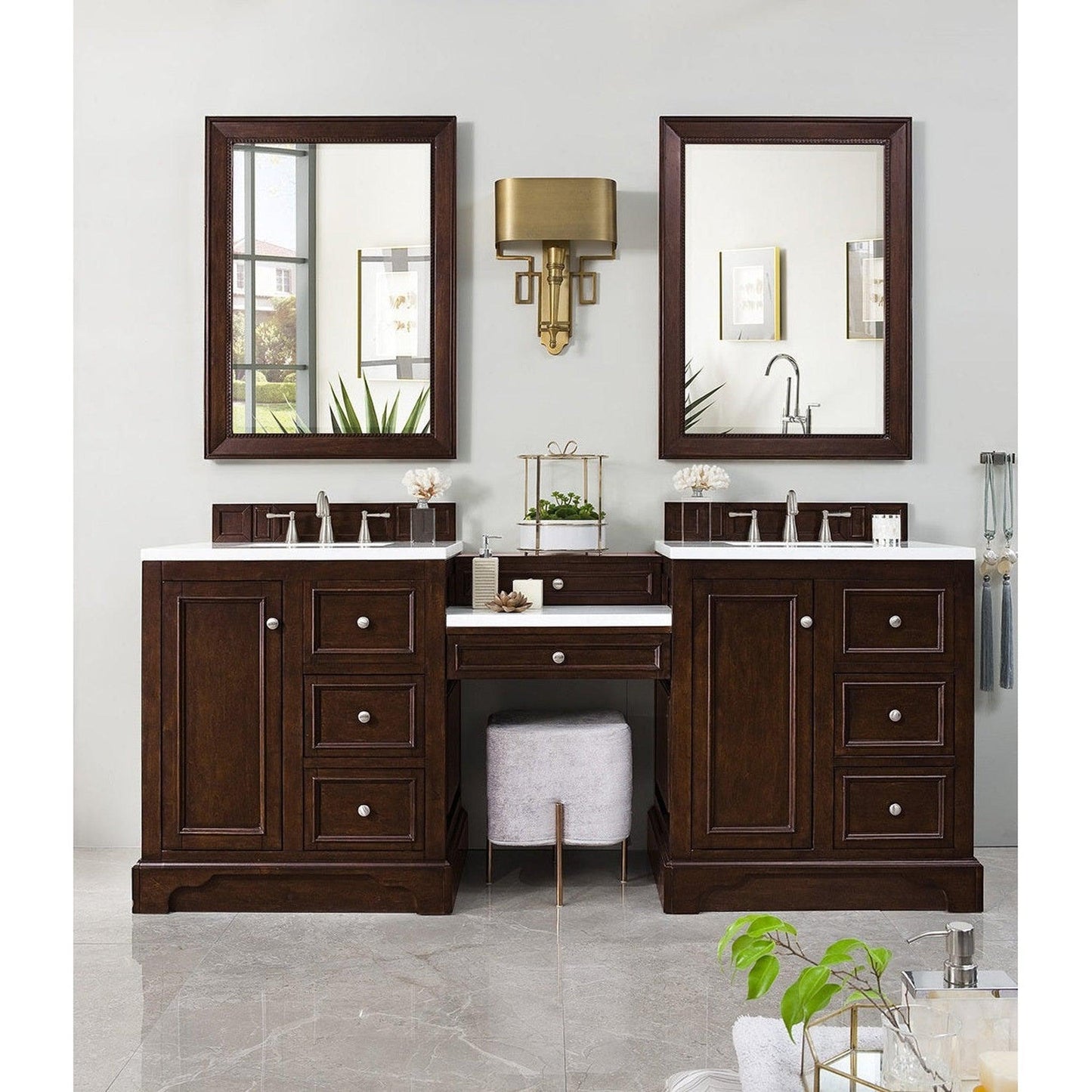 James Martin Vanities De Soto 82" Burnished Mahogany Double Vanity Set With Makeup Table, 3cm White Zeus Quartz Top