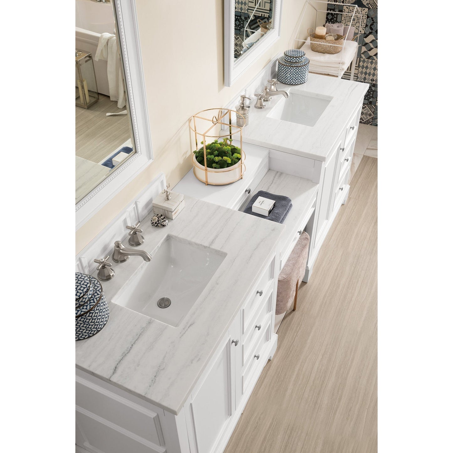 James Martin Vanities De Soto 94" Bright White Double Vanity Set With Makeup Table, 3cm Arctic Fall Solid Surface Top