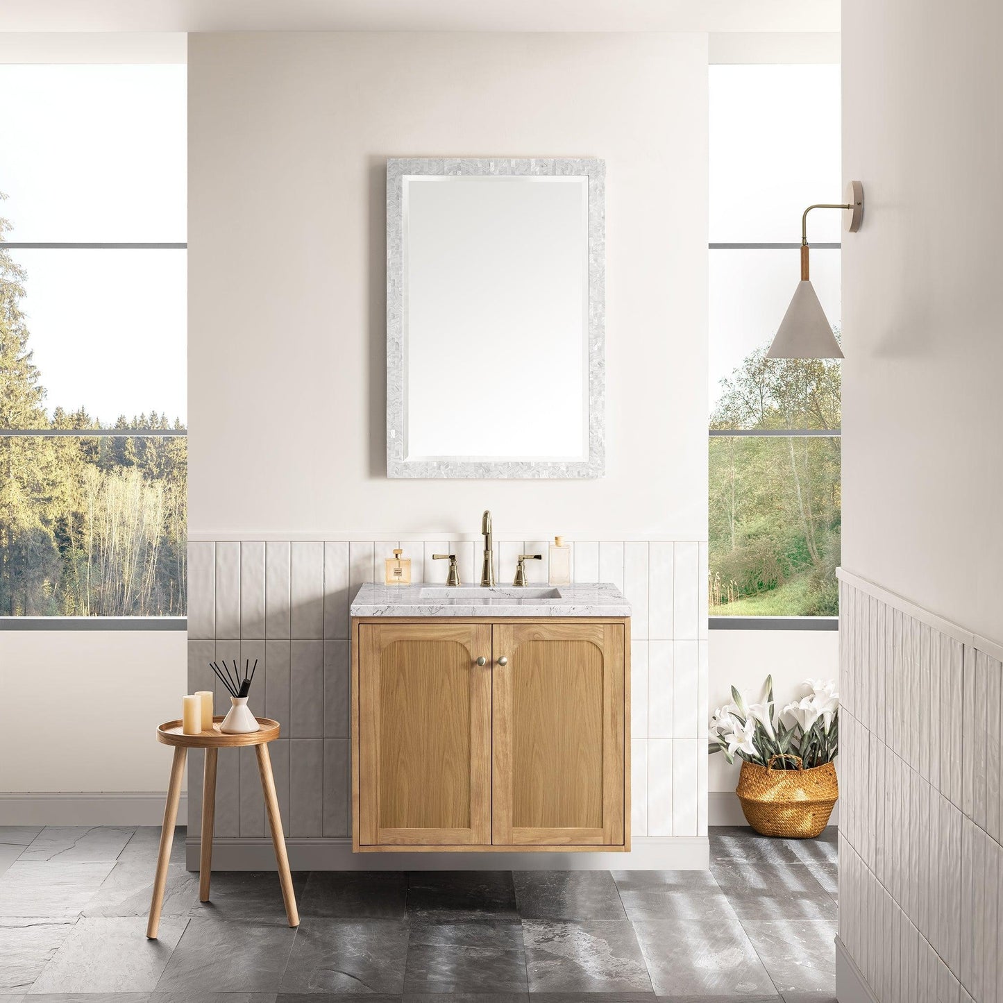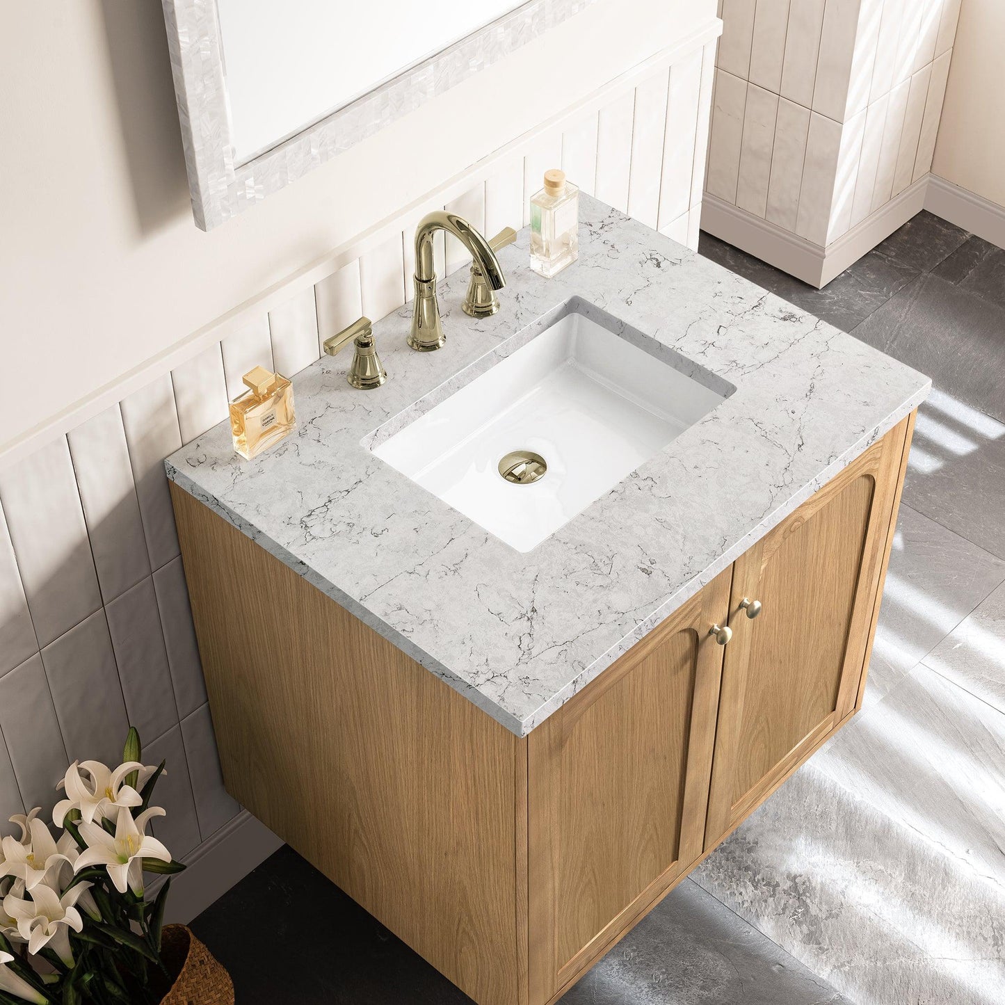 The 30" Laurent Single Vanity features picture frame detailing with unexpected soft curves. The Light Natural Oak finish over cathedral grain ash veneers creates modern rustic appeal. This vanity offers two doors that open to an adjustable shelf and convenient dual power and USB outlet. Choose to install it as a free-standing vanity with the modern wood base, or choose to float it on your wall using our durable french cleat hardware. The beautiful natural wood texture, elegant detailing, and Champagne Brass knobs create a point of interest in any bathroom space. The 3cm Eternal Marfil Silestone quartz top adds the final touch.