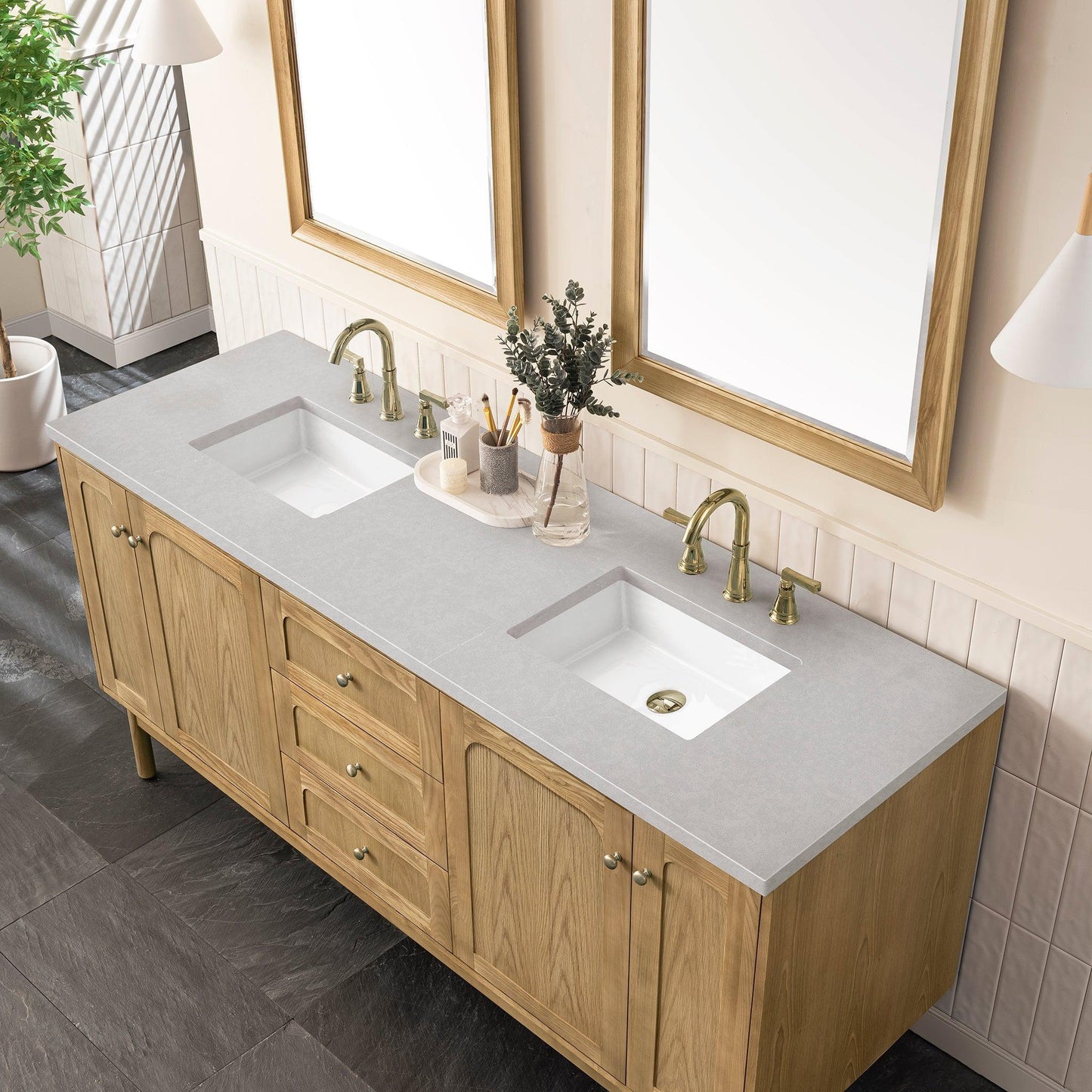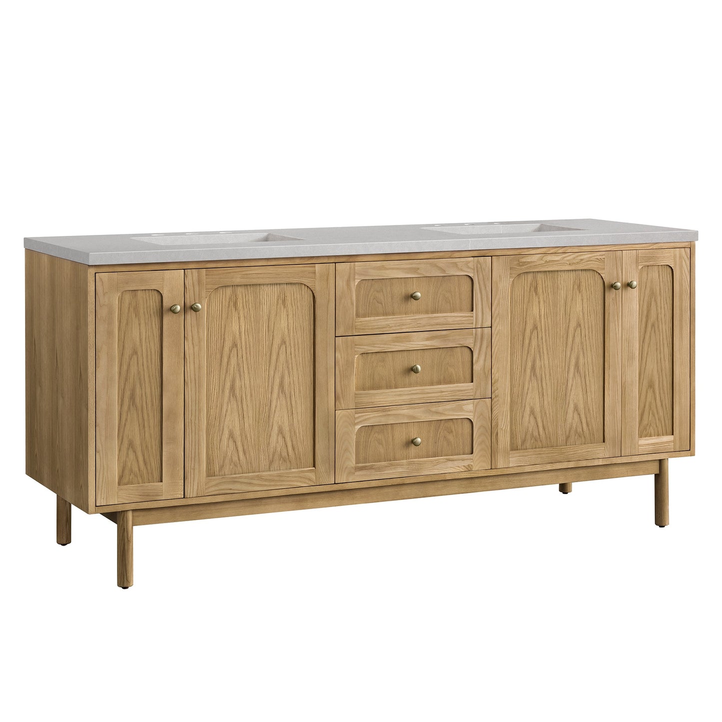 The 72" Laurent Single Vanity features picture frame detailing with unexpected soft curves. The Light Natural Oak finish over cathedral grain ash veneers creates modern rustic appeal. This vanity boasts five generously sized drawers and a removable bamboo storage tray. The dual doors open to adjustable shelves and convenient dual power and USB outlet. One internal tray-style drawer is concealed behind both outer doors. Choose to install it as a free-standing vanity with the modern wood base, or choose to float it on your wall using our durable french cleat hardware. The beautiful natural wood texture, elegant detailing, and Champagne Brass knobs create a point of interest in any bathroom space. The 3cm Eternal Serena Silestone quartz top adds the final touch.