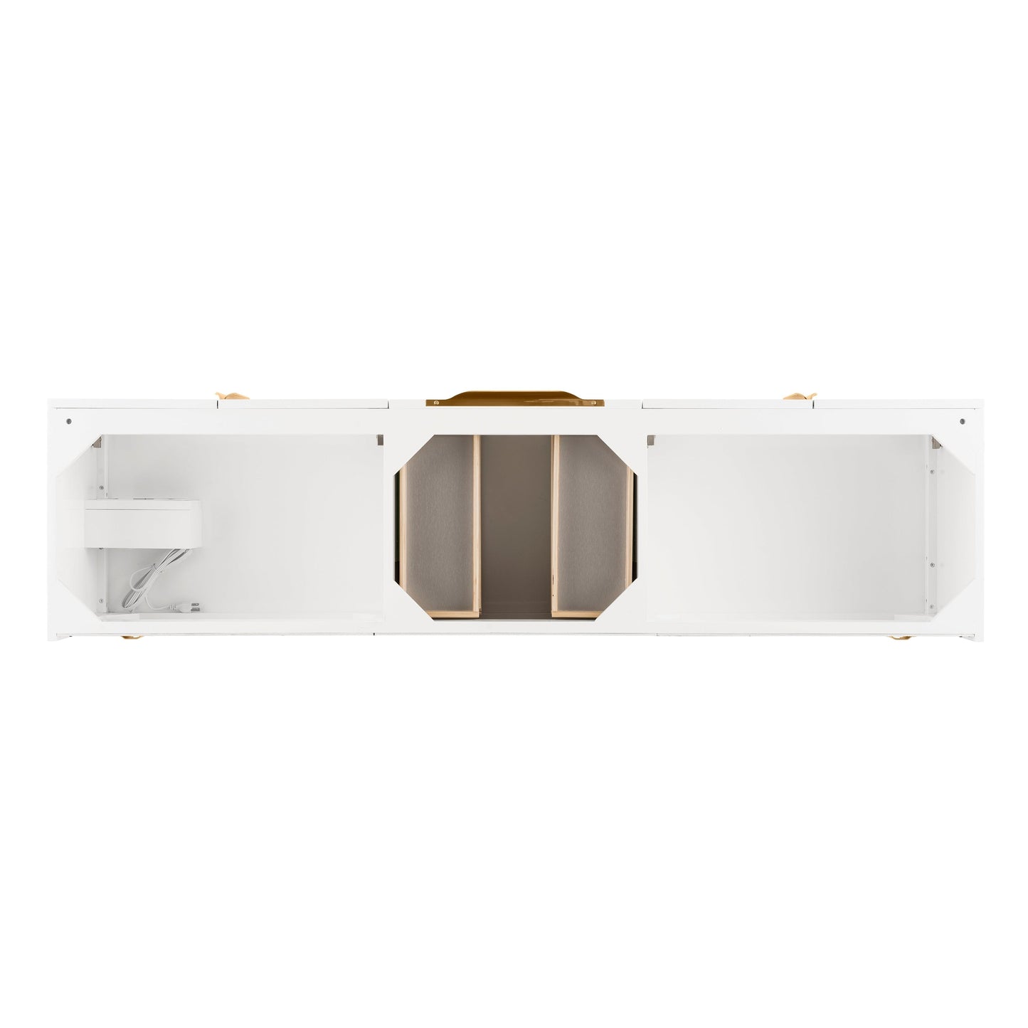 The Mercer Island 72" Glossy White vanity offers maximum storage with two soft-closing doors, three soft-closing drawers, and lower shelf space. This cabinet comes with premium features such as one solid bamboo in-drawer organizer and one 120 Volt UL rated electrical component with two electrical and two USB (2.0) outlets. Cabinet includes radiant gold door and drawer pulls. This wall mounted vanity comes with heavy duty mounting brackets to create a modern look.
