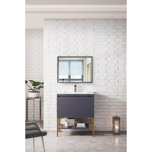 James Martin Vanities Milan 31.5" Modern Grey Glossy, Radiant Gold Single Vanity Cabinet With Glossy White Composite Top