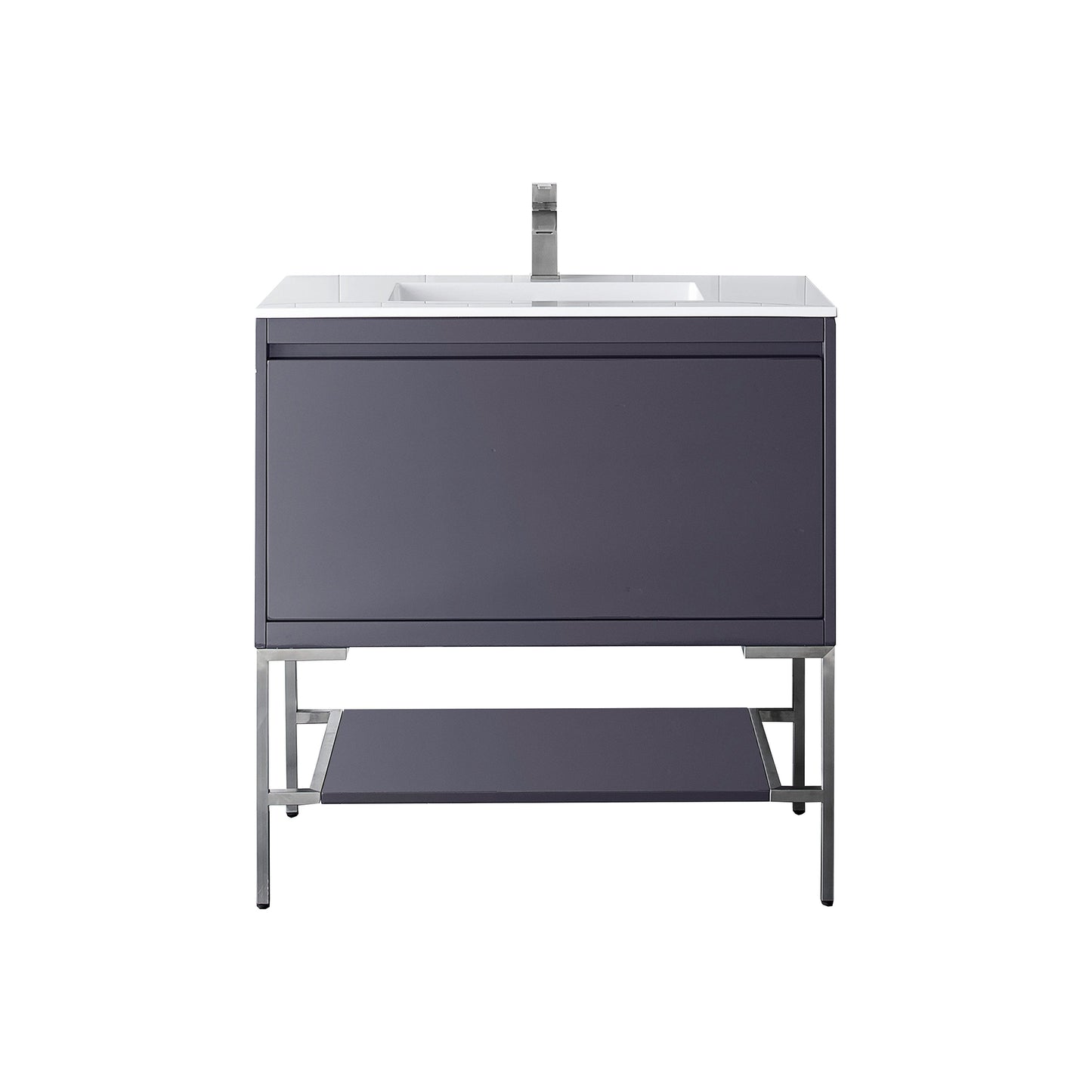 James Martin Vanities Milan 35.4" Modern Grey Glossy, Brushed Nickel Single Vanity Cabinet With Glossy White Composite Top