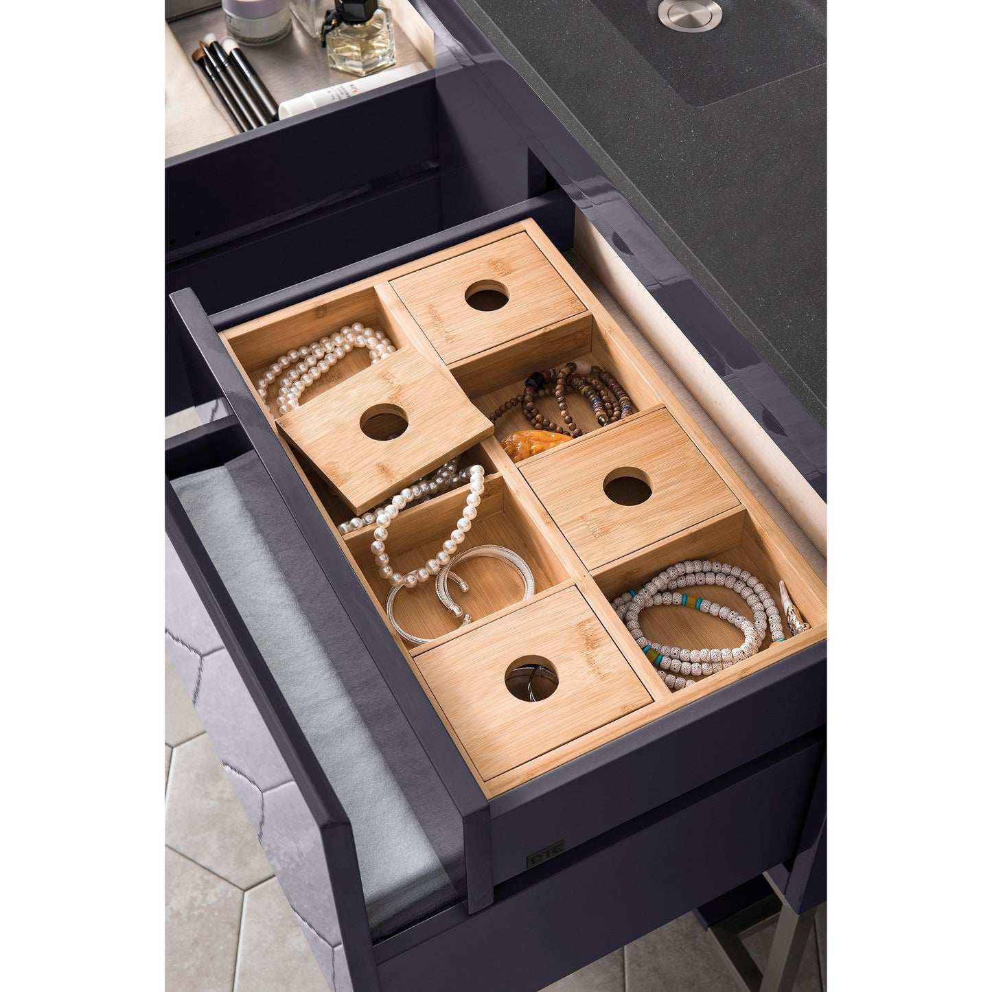 The Milan 47.3” vanity cabinet by James Martin Vanities will elevate your space by adding a touch of timeless décor to your bathroom. This vanity collection combines a cutting-edge design with pristine craftmanship to bring your bathroom a clean modern look providing you with both style and functionality. Generous storage features include soft close drawers with a removable organizer.
