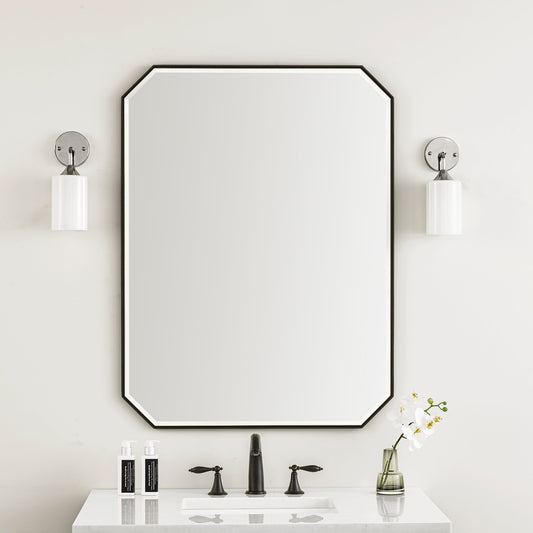 A minimalistic metal frame surrounds the beautiful 30" octagonal Rohe beveled mirror. Inspired by modern framed canvas art, the mirror appears as if it is floating inside the frame, adding visual interest. The simplicity, elegance, and neutrality of the Matte Black finish making the Rohe mirror collection the perfect accent for your bathroom vanity and living spaces.