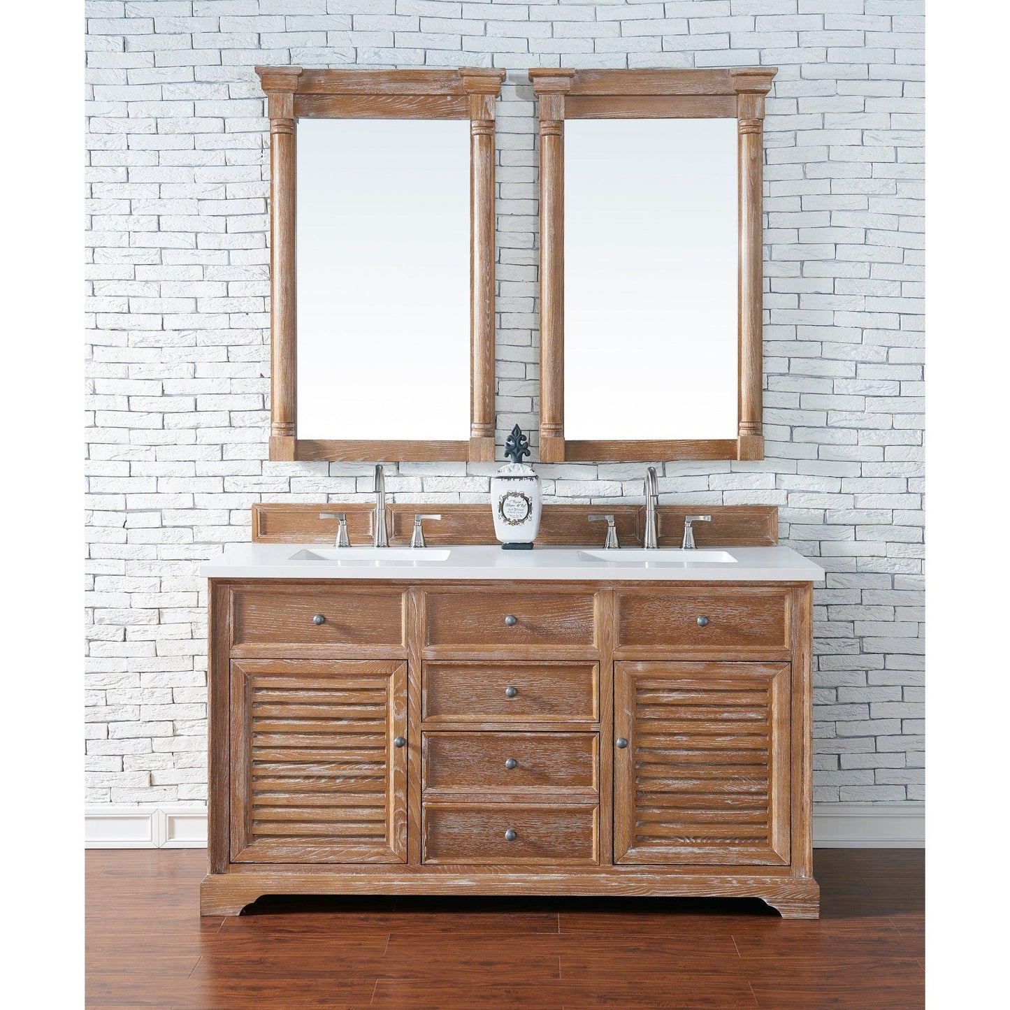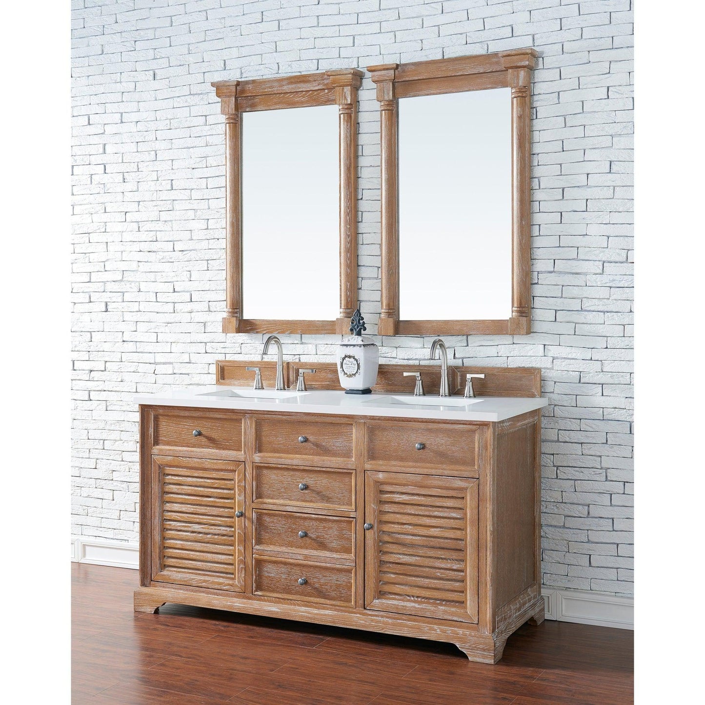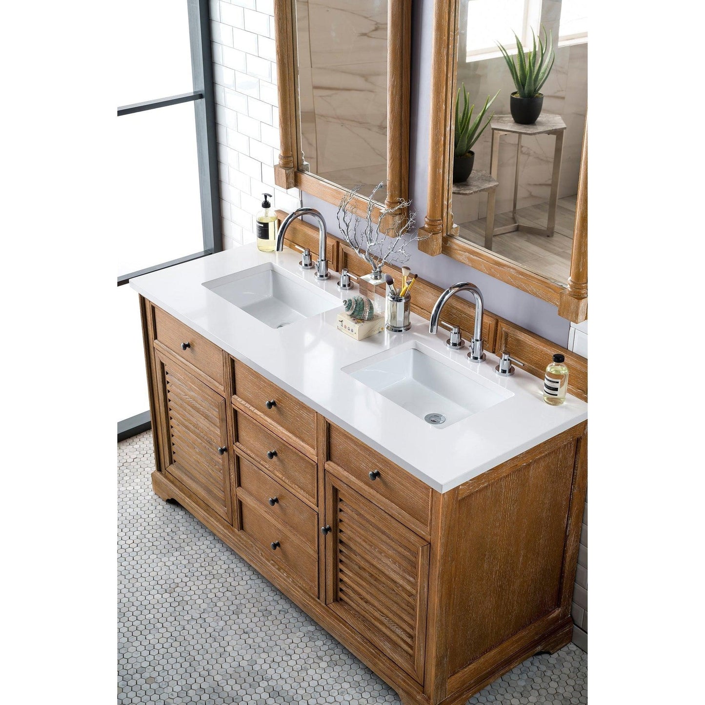 The Savannah 60", double sink, Driftwood vanity by James Martin Vanities features a Savannah Shutter with Pewter finish door and drawer pulls adorn two doors, with shelves for storage, and two drawers, with the bottom center drawer being double height for taller items. Top three drawers are "false drawers" to allow for sink placement. Matching decorative wood backsplash is included. The look is completed with a polished White Zeus top by Silestone and premium solid surface sink(s).