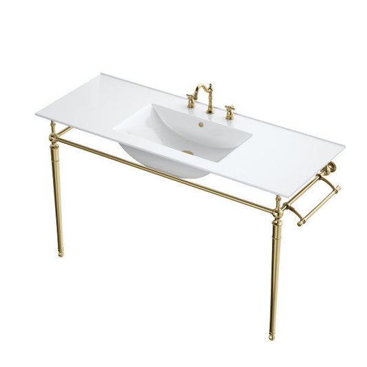 The Westley 47.2" Single Console Single Sink with Brass Finish Stand features a wall mount metal base that includes a convenient towel rack and Porcelain sink. With an open base that maximizes space and allows for easy cleaning, this vanity is designed to fit any space from the master bath to the powder room.