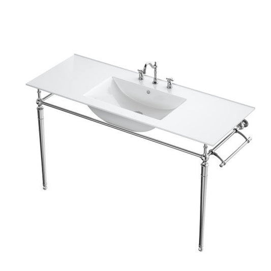 The Westley 47.2" Single Console Single Sink with Chrome Finish Stand features a wall mount metal base that includes a convenient towel rack and Porcelain sink. With an open base that maximizes space and allows for easy cleaning, this vanity is designed to fit any space from the master bath to the powder room. A unique and clean look, the Westley is practical and functional.