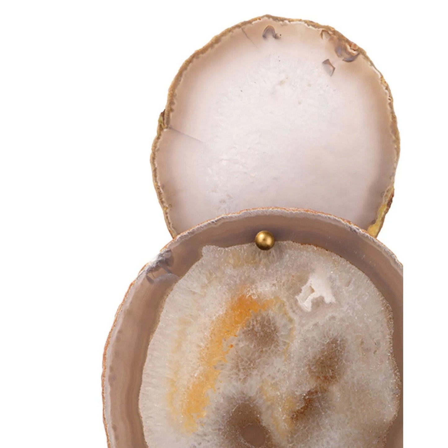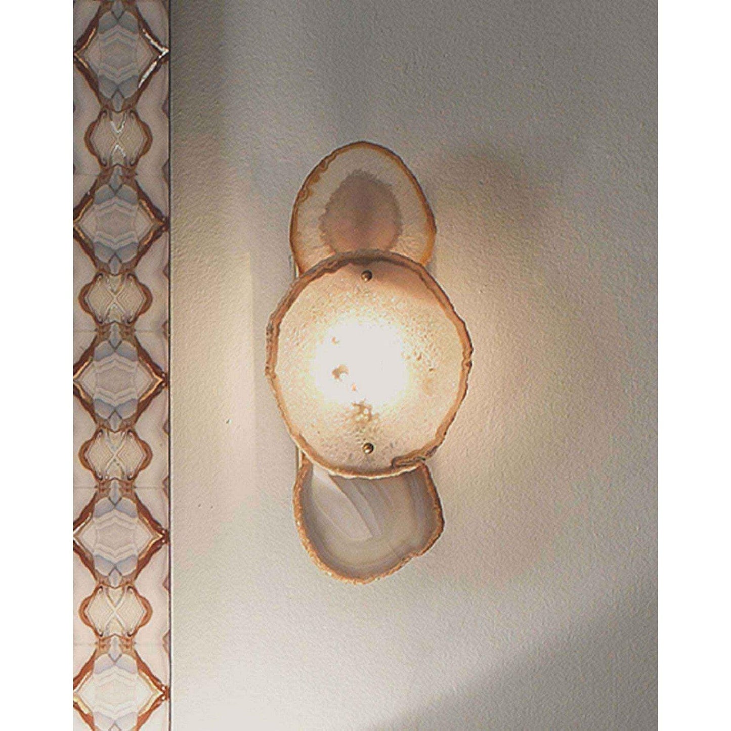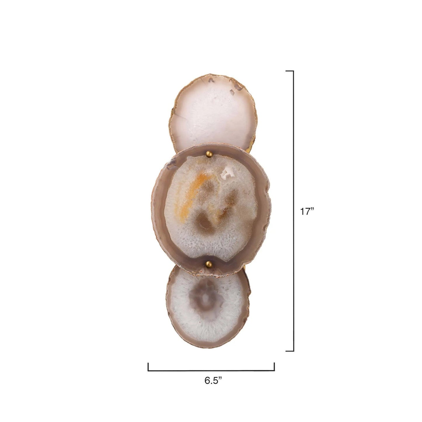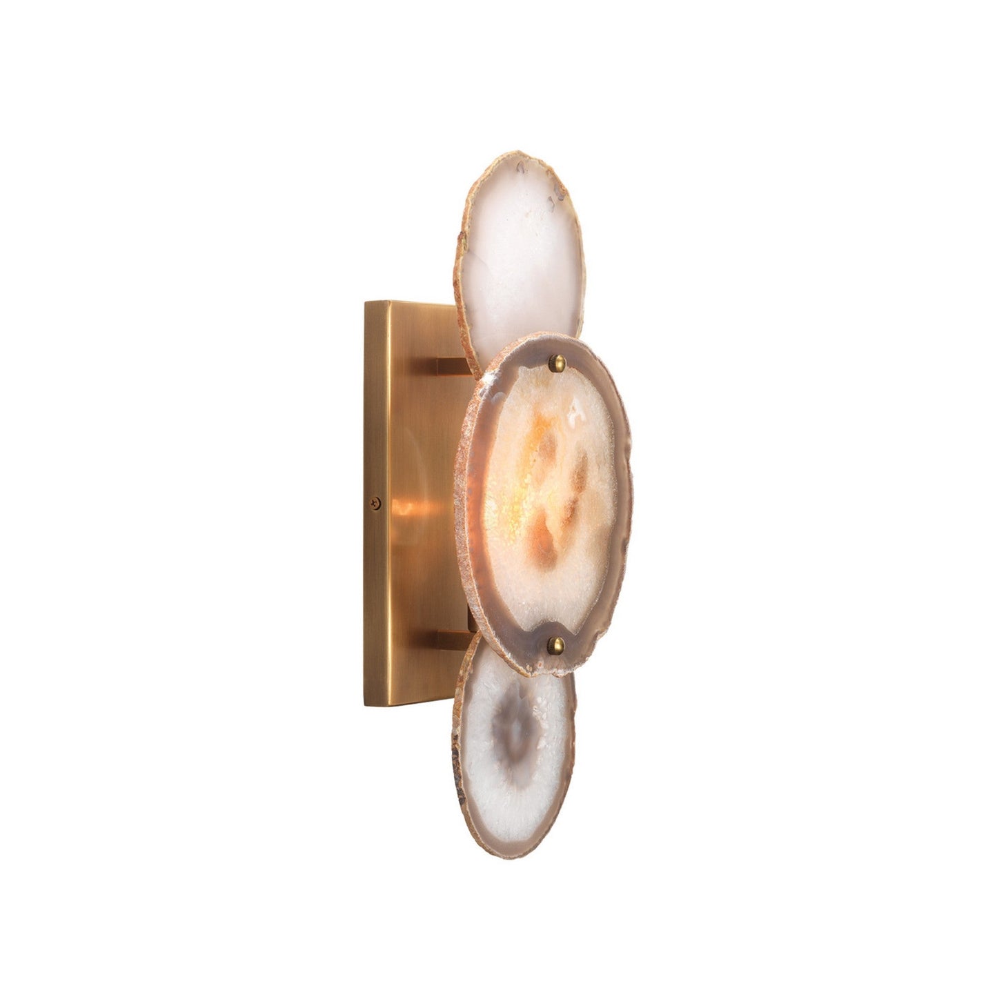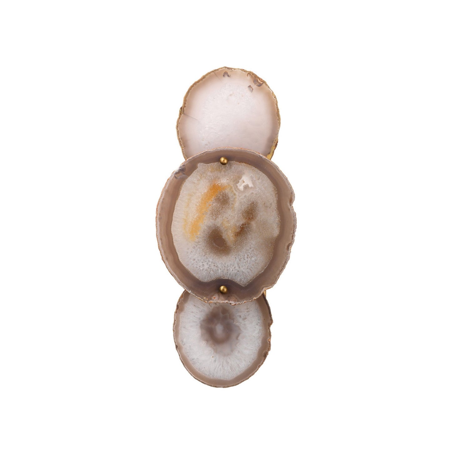 Three unique slices of natural agate stone are individually arranged to create extraordinary pieces of art. Embrace this wall sconce's individuality and you will have a truly one-of-a-kind piece on your wall.