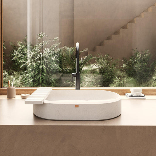 Ubud02 is a handcrafted, vessel-type sink that showcases the endless possibilities of concrete. Using a high-performance mixture and natural materials that have an honest authenticity that we as human beings find naturally seductive.