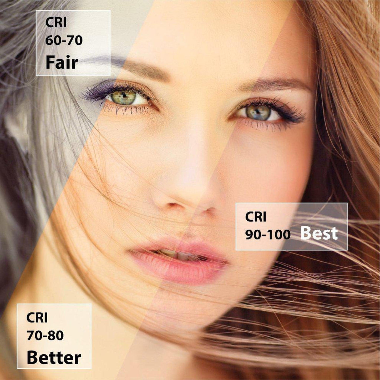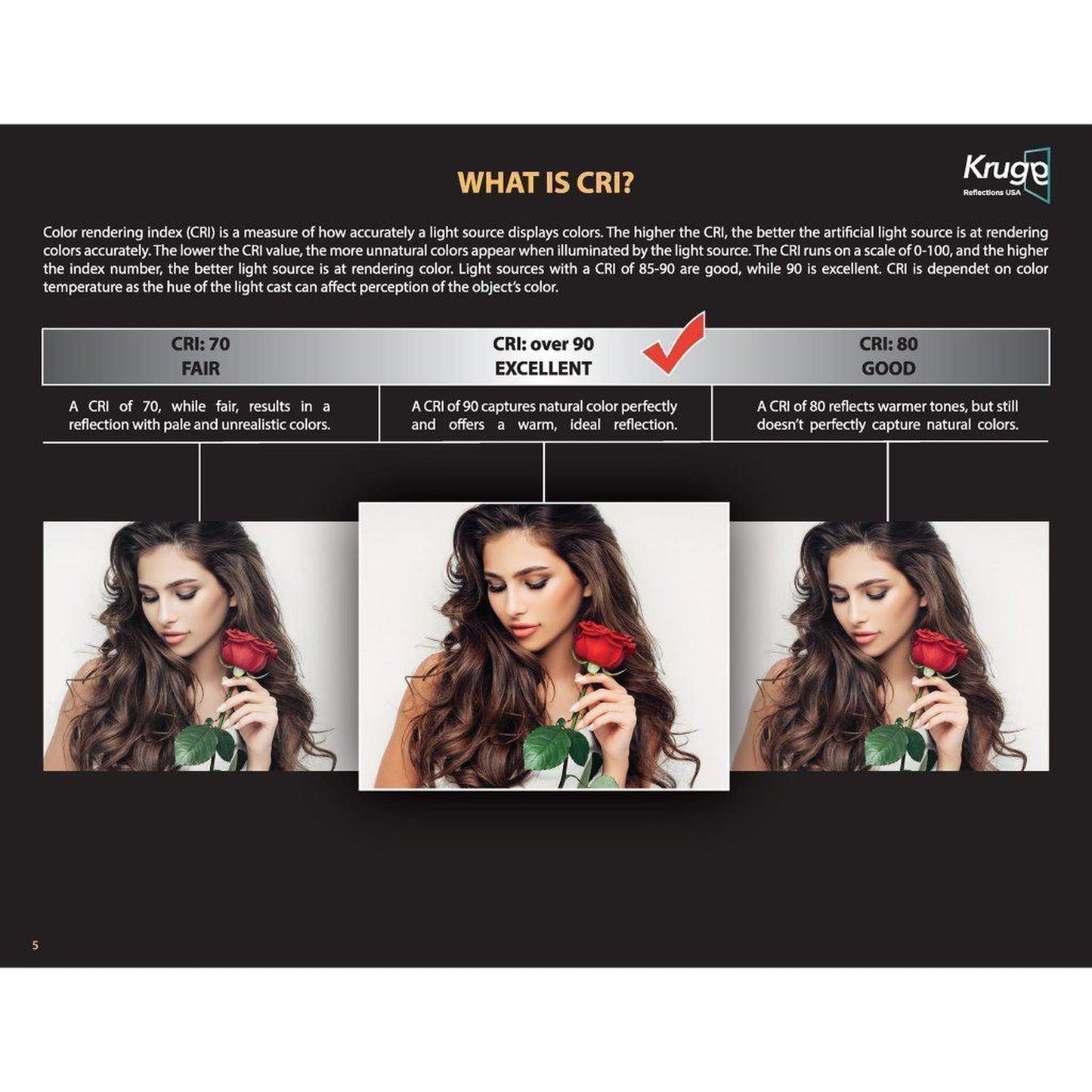 Color rendering index (CRI) is a measure of how accurately a light source displays colors. The higher the CRl, the better the artificial light source is at rendering colors accurately. The lower the CRI value, the more unnatural colors appear when illuminated by the light source. The CRI runs on a scale of 0-100, and the higher the index number, the better the light source is at rendering color. Light sources with a CRI of 85-90 are good, while 90 is excellent. CRI is dependent on color temperature as the hue of the light cast can affect the perception of the object's color.