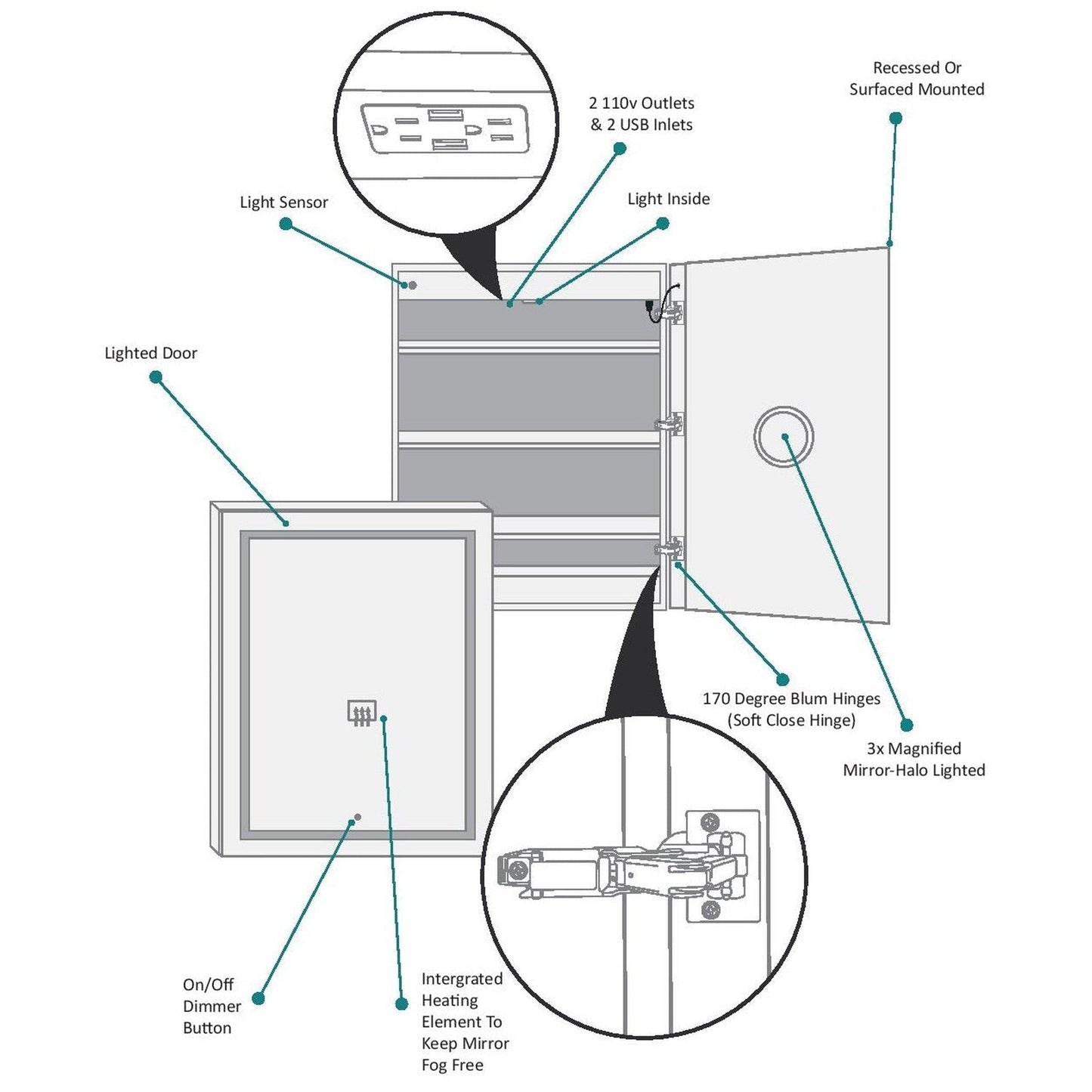 - Convenient - Built-in 3X Magnifying Lighted Mirror on the Back of Lighted Mirror Door