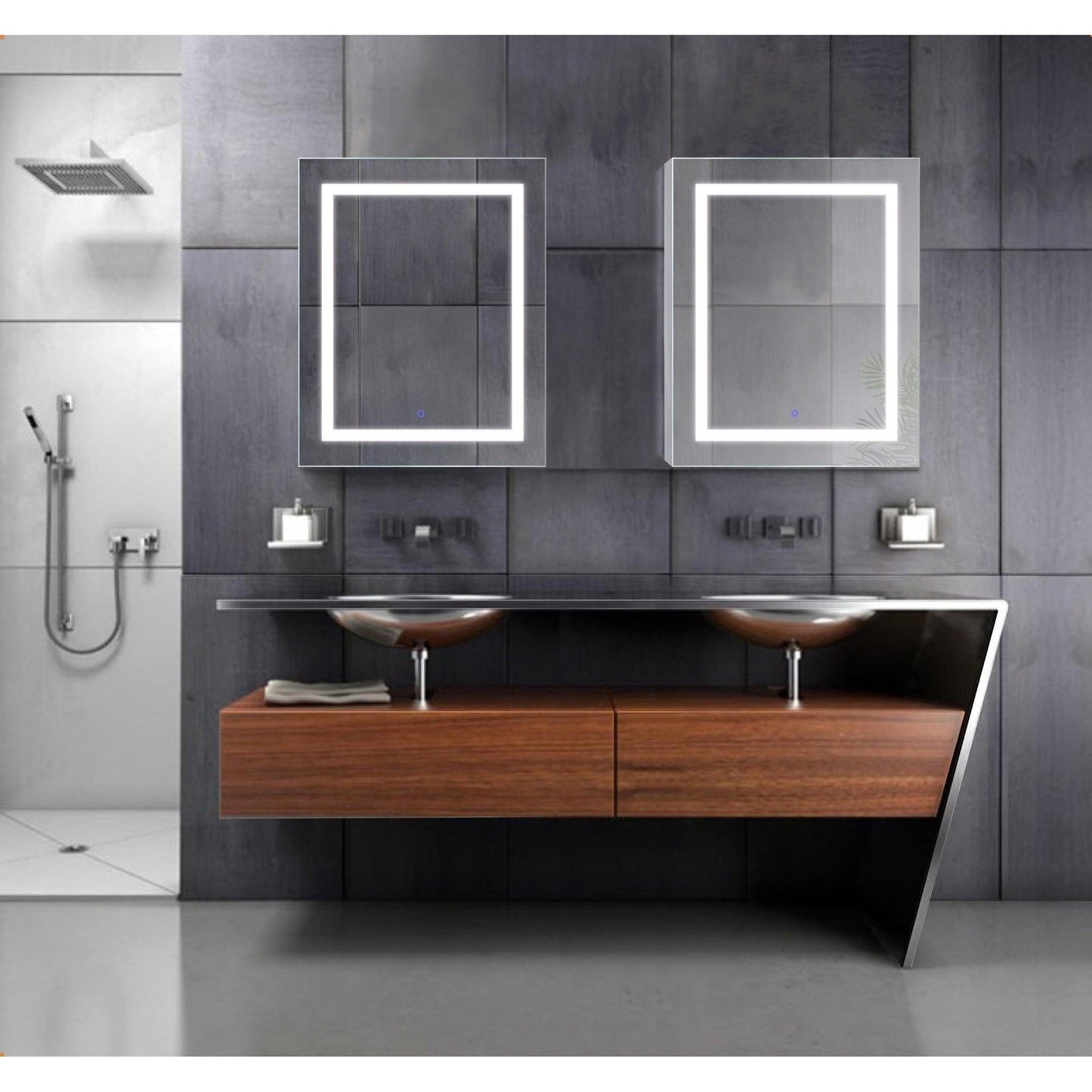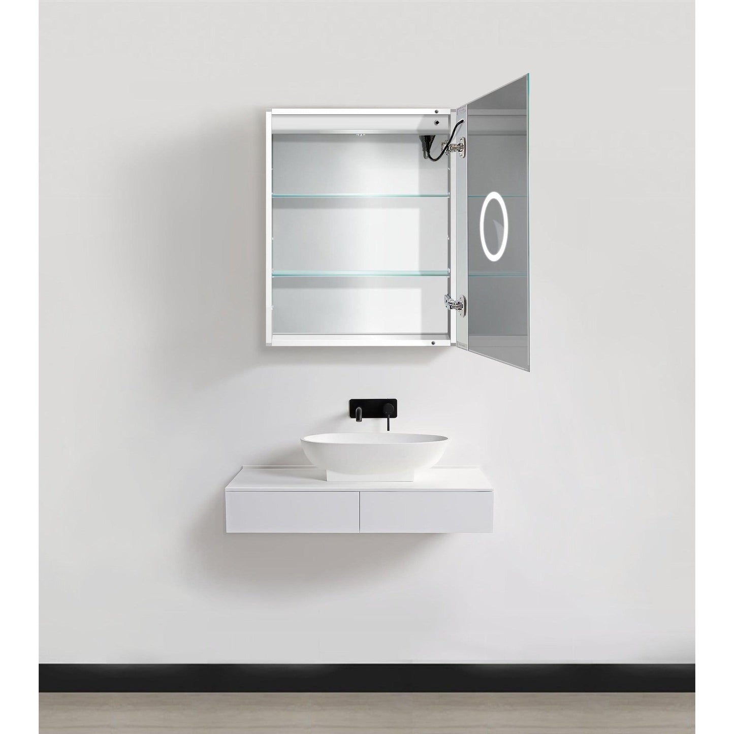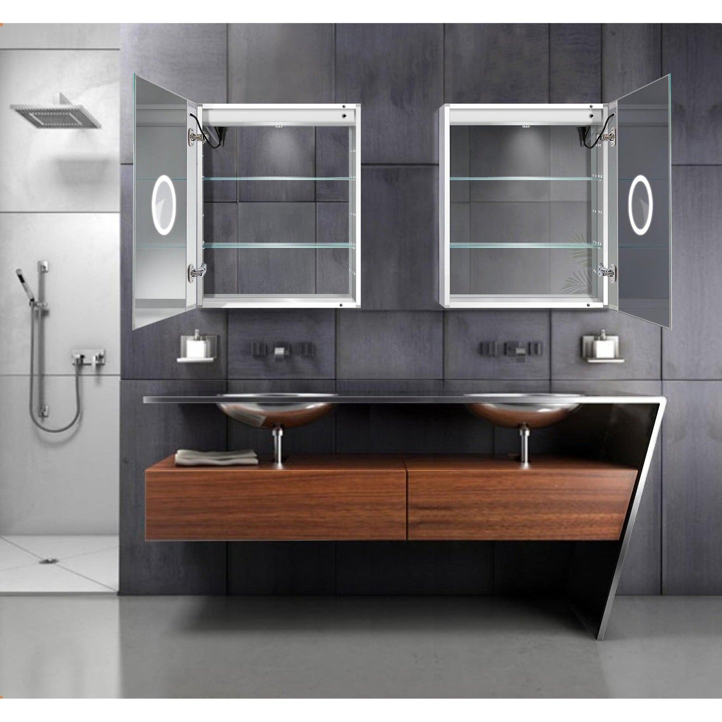 Effortless to use, a revolutionary touch icon is integrated into the mirror face for seamless on/off toggling and dimming with memory functionality Open the lighted section cabinet to reveal the full suite of amenities. In the mirrored door, a 3x magnified, LED-lit mirror is perfect for detailed makeup application. The mirrored interior is illuminated automatically for a luxurious touch.