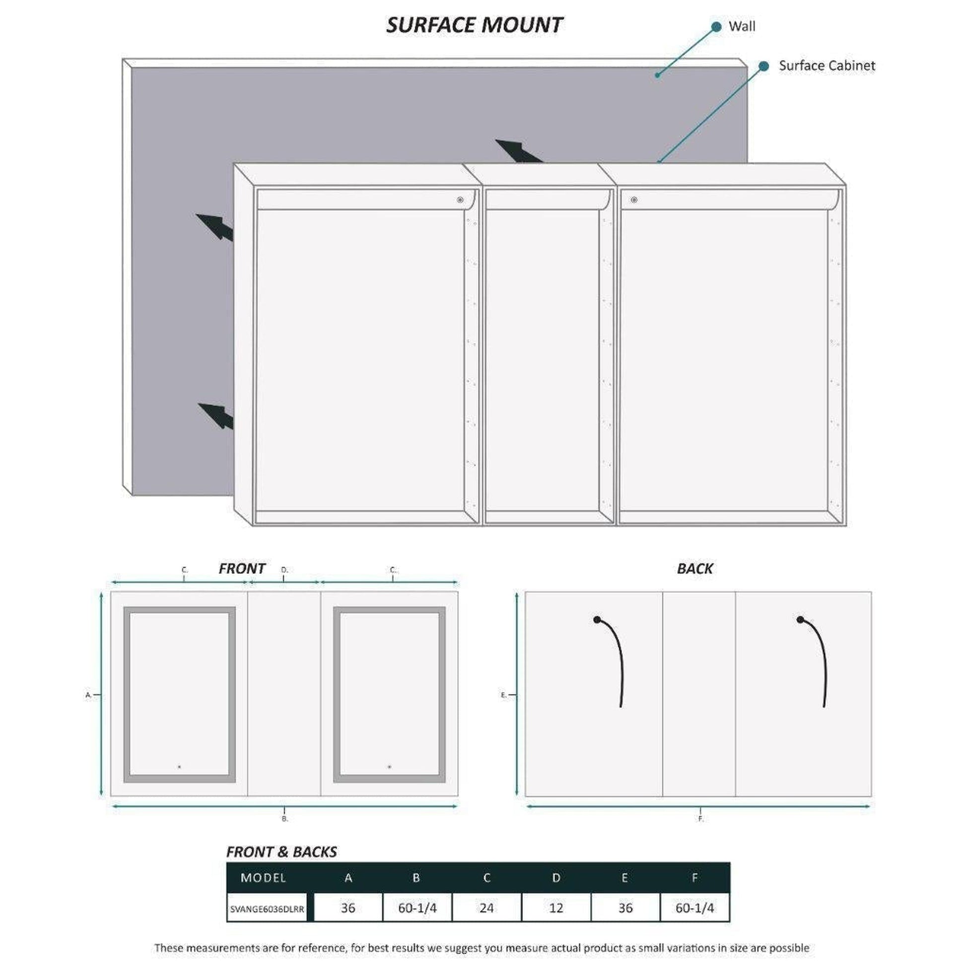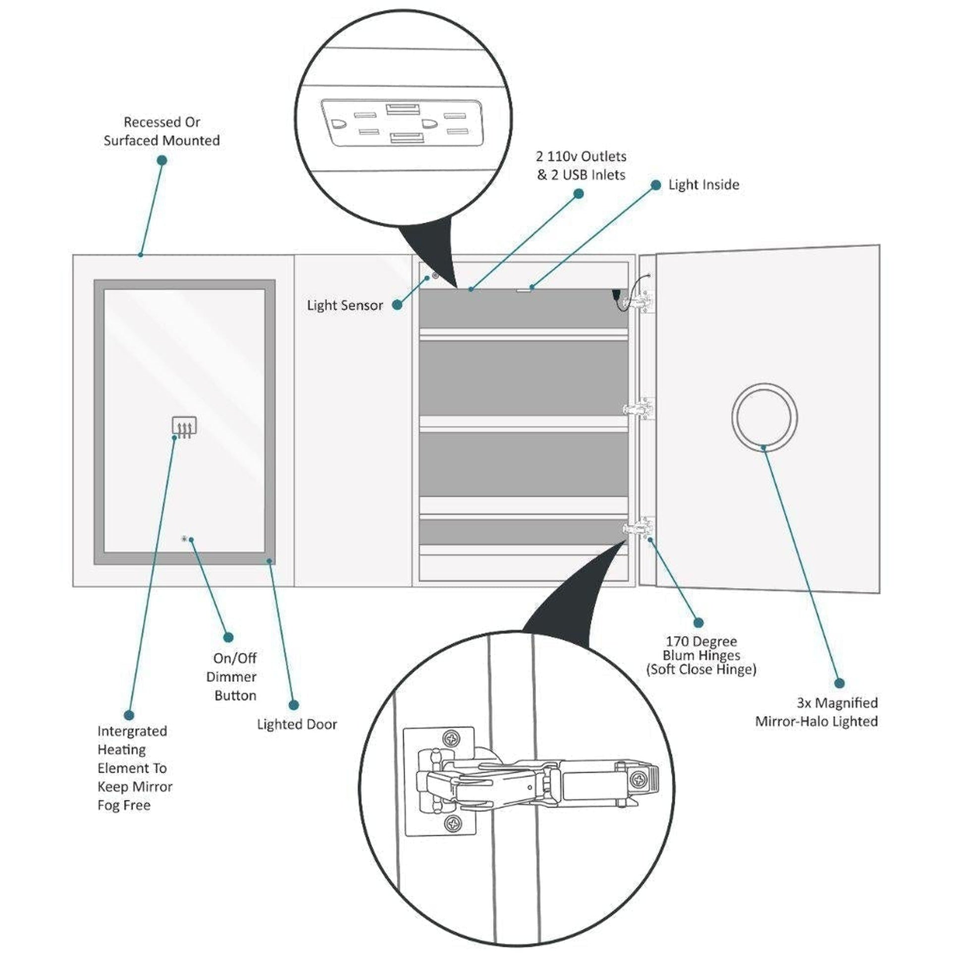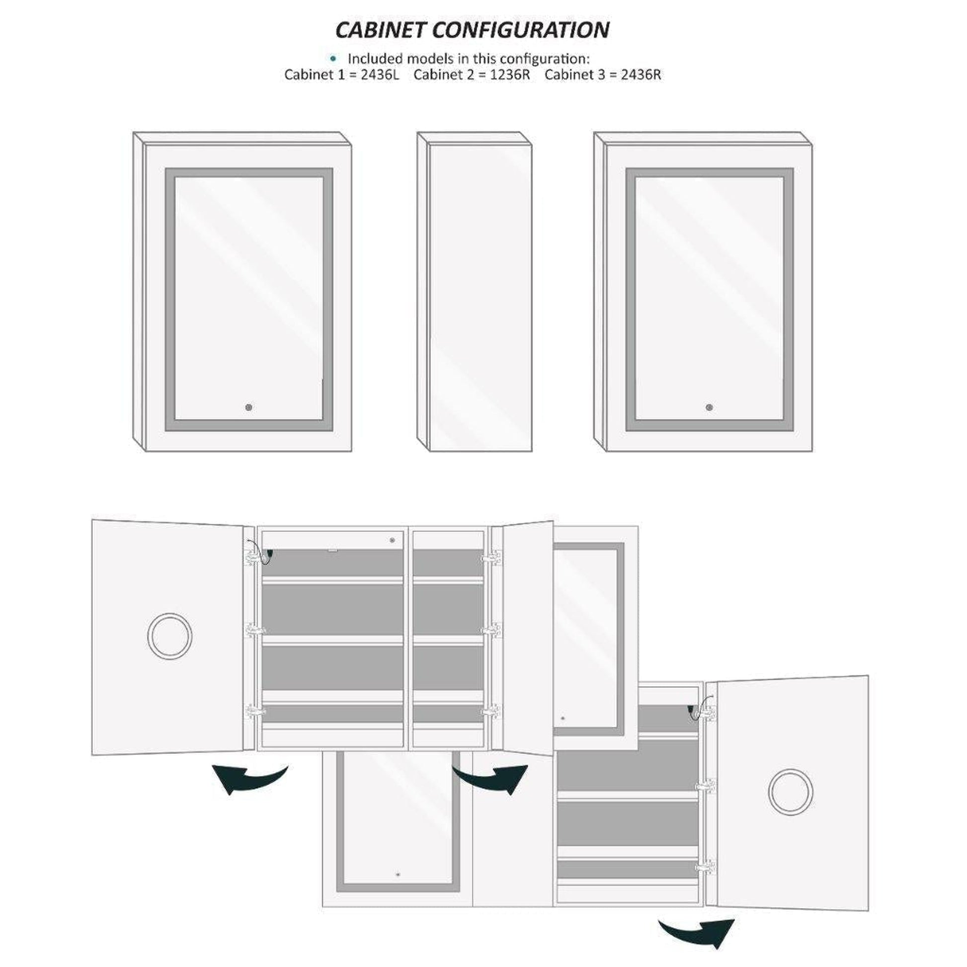 Our wide-angle hinges provide freedom of motion and panorama. The 2+2 smart outlet contains two traditional outlets and two USB interfaces to keep beauty tools, as well as a smartphone or tablet, close at hand. We ensure reliable optical clarity with active defogging technology. This LED Medicine Cabinet is limited only by your imagination. Cabinet is made up of 2 Components, 2 x Lighted section is 24"x36", and None Lighted Section is 12"x36".