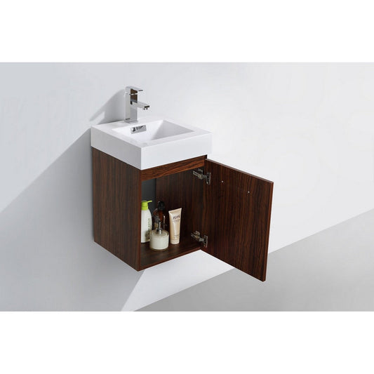 KubeBath Bliss 16" Walnut Wall-Mounted Modern Bathroom Vanity With Single Integrated Acrylic Sink With Overflow and 22" Walnut Wood Framed Mirror With Shelf