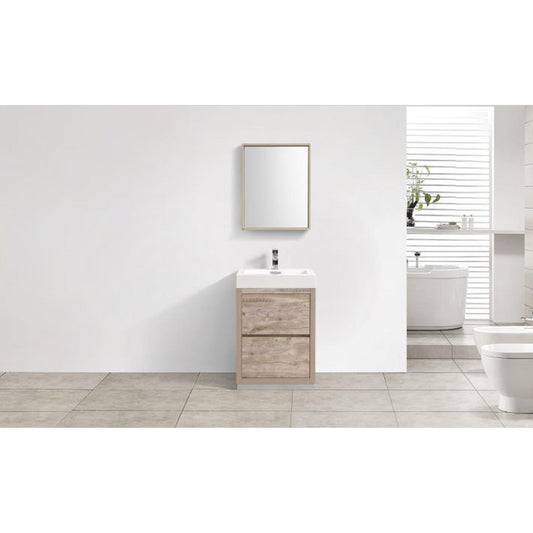 KubeBath Bliss 24" Nature Wood Freestanding Modern Bathroom Vanity With Single Integrated Acrylic Sink With Overflow and 24" Wood Framed Mirror With Shelf