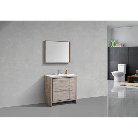 KubeBath Dolce 36" Nature Wood Freestanding Modern Bathroom Vanity With Quartz Vanity Top & Ceramic Sink With Overflow and 36" Wood Framed Mirror With Shelf
