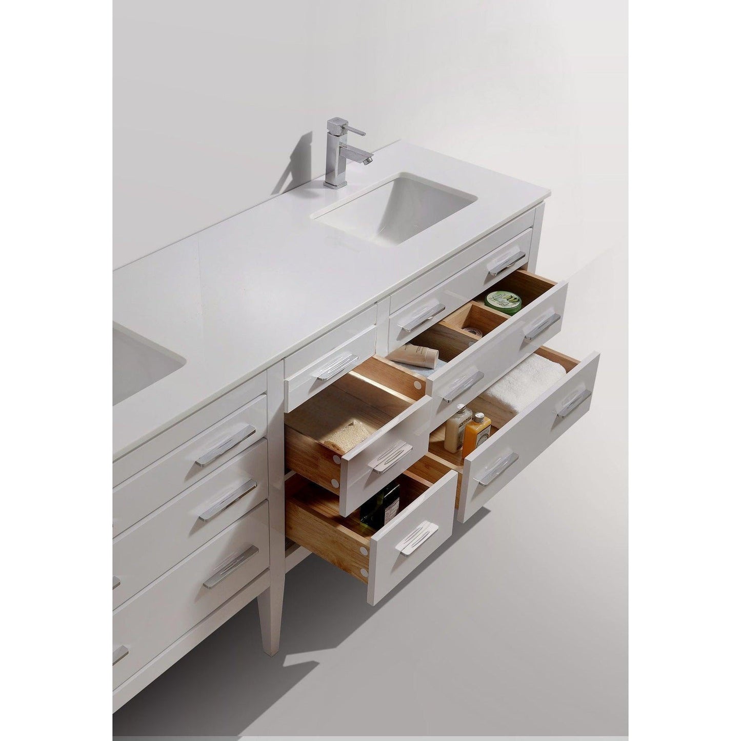Inspired by both the art deco movement of the ’20s, ’30s, and ’40s and the elegant simplicity of European design, the Eiffel Bathroom Vanity was created from responsibly sourced Solid Wood. Each piece is assembled using intricate shapes that slot together forming a sturdy yet graceful structure. The Eiffel 60″ Double Sink Vanity features six fully functional drawers, a pure white countertop with White Ceramic under-mount Sinks. The cabinet is finished in a white lacquer paint finish, while the inside of the drawers is varnished, with the natural wood color exposed.