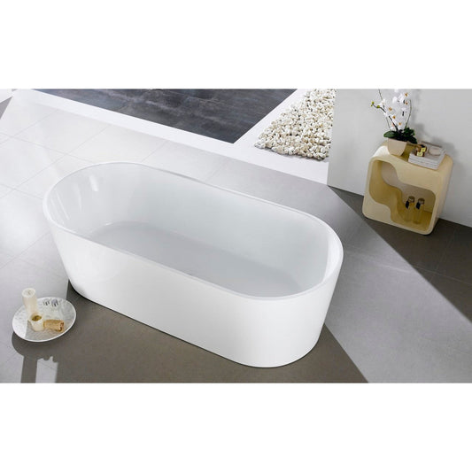 KubeBath Kube Ovale 67" White Acrylic Freestanding Bathtub With Slim Rectangular Overflow and Brass Pop-Up Drain