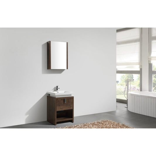 KubeBath Levi 24" Rose Wood Freestanding Bathroom Vanity With Cubby Hole & Reinforced Acrylic Composite Sink With Rectangular Chrome Overflow and 24" White Framed Mirror With Shelf