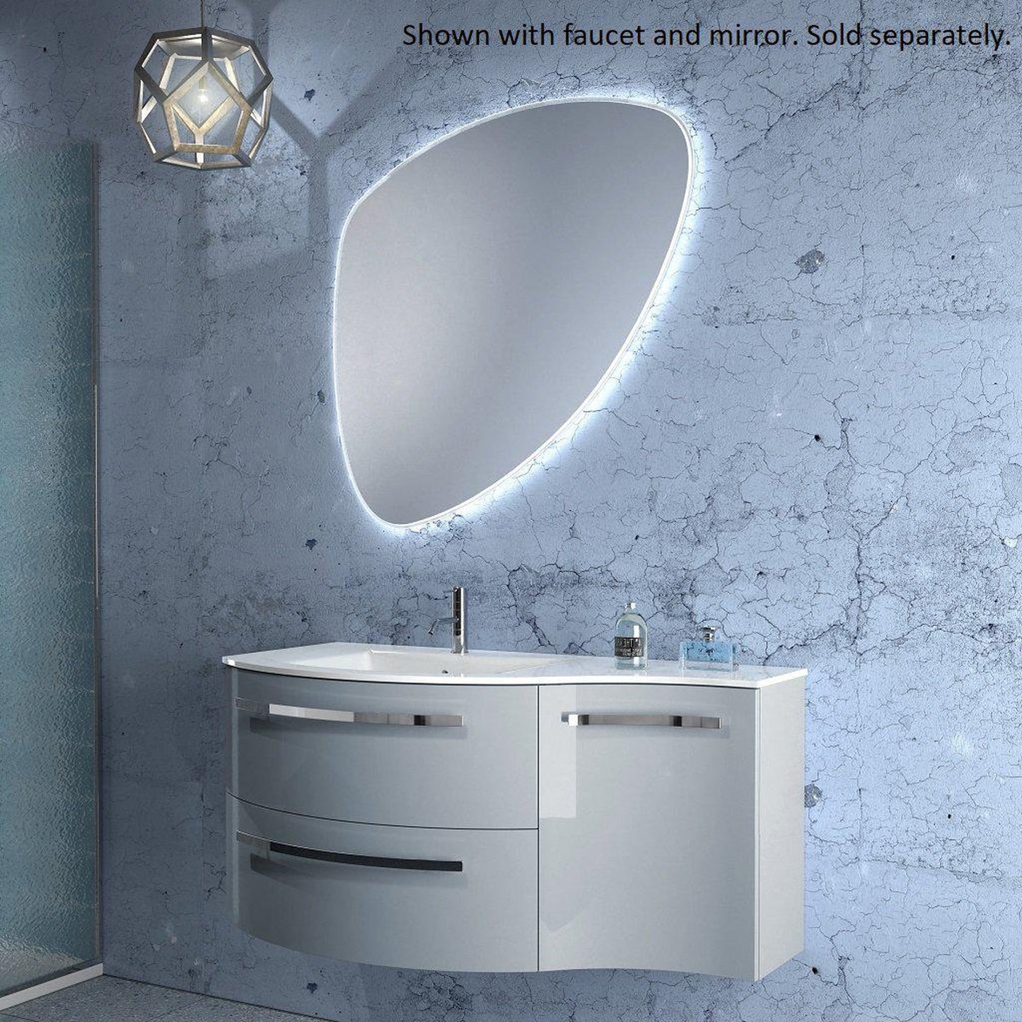 LaToscana Ameno 43" wall-mounted vanity set includes AML035 vanity piece which has two soft-closing drawers, along with LV121S integrated washbasin in white TekorLux with overflow. It also comes with AMB018R right concave cabinet with soft-closing door and 1 glass shelf.