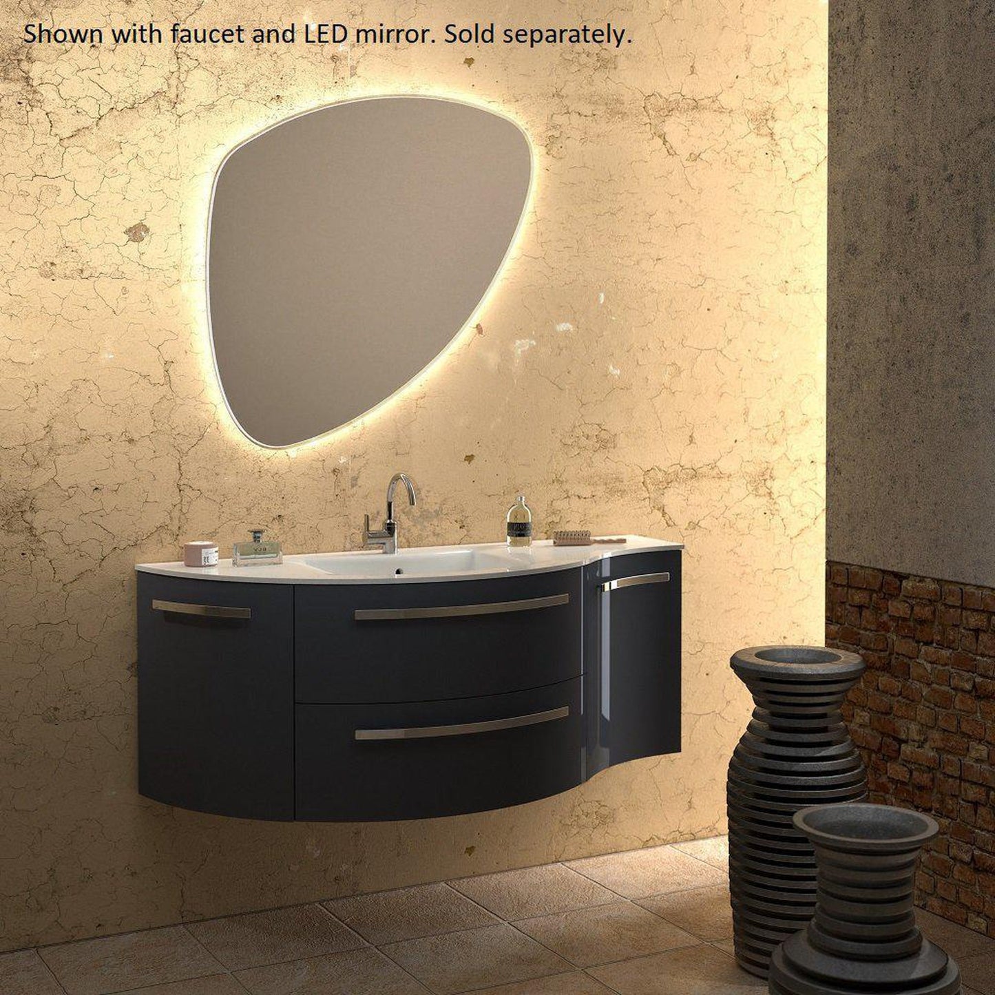 LaToscana Ameno 52" wall-mounted vanity set includes AML035 vanity piece which has two soft-closing drawers, along with LV144S top for B017R with integrated washbasin in white TekorLux with overflow. It also comes with AMB017L left rounded cabinet and AMB018R right concave cabinet, which has soft-closing doors and one glass shelf each.