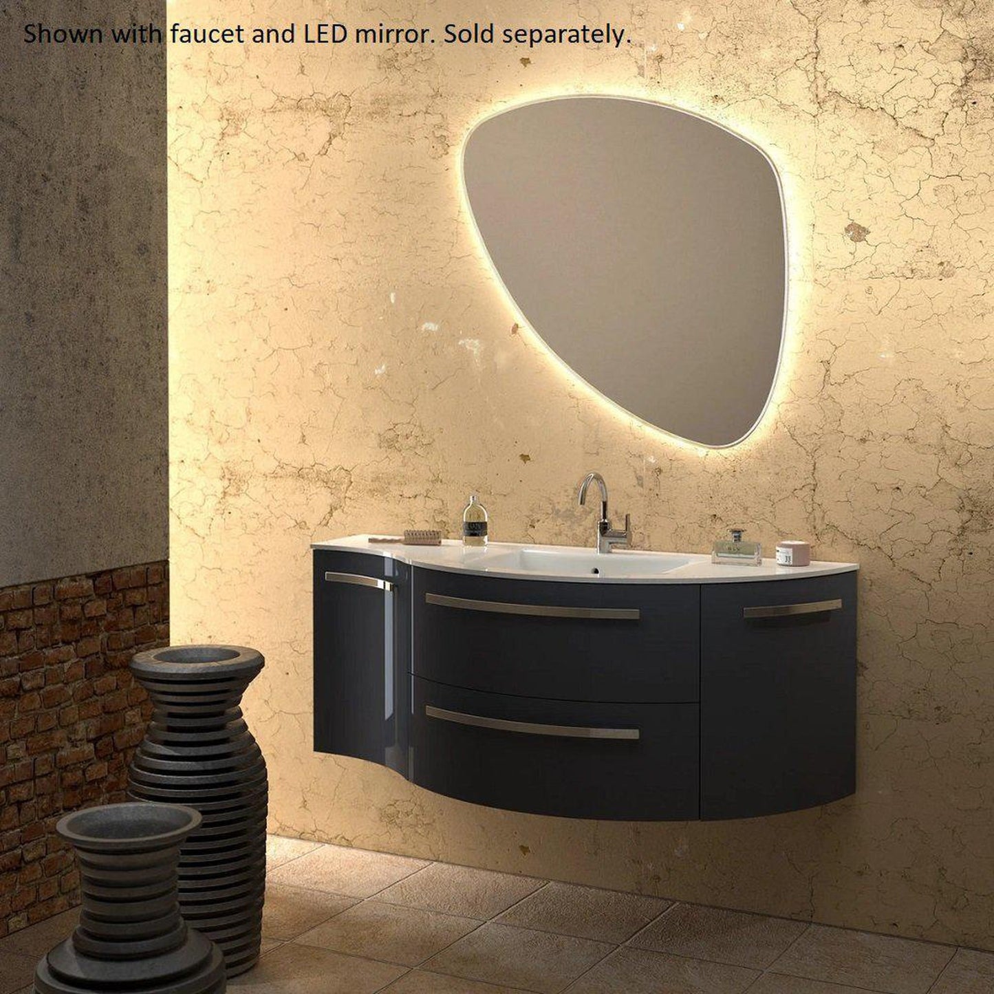 LaToscana Ameno 52" wall-mounted vanity set includes AML035 vanity piece which has two soft-closing drawers, along with LV144D top for B017R with integrated washbasin in white TekorLux with overflow. It also comes with AMB017R right rounded cabinet and AMB018L left concave cabinet, which has soft-closing doors and one glass shelf each.