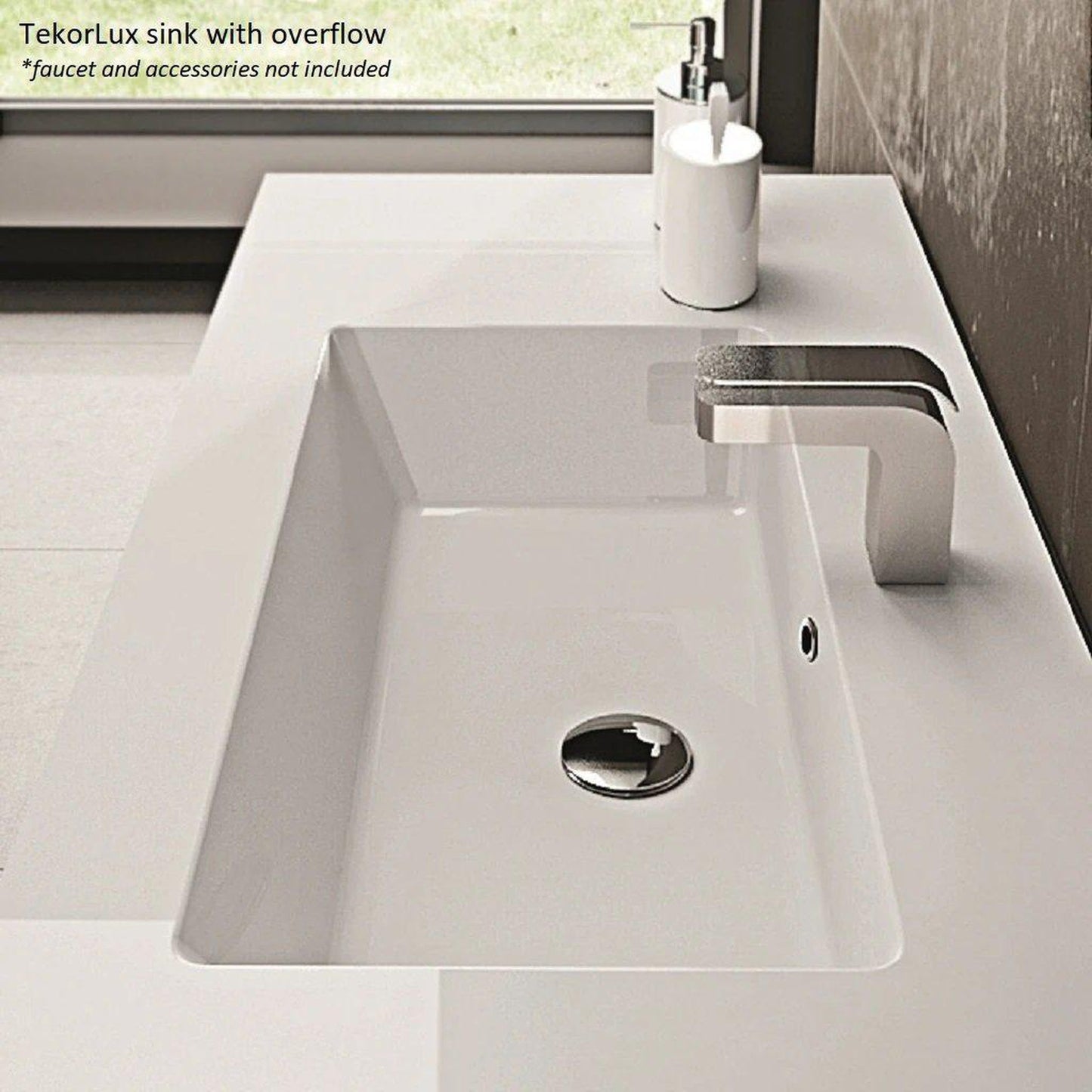 LaToscana Oasi 43" wall-mounted vanity set includes L035 vanity piece which has two soft-closing drawers, along with LV049S integrated washbasin in white TekorLux with overflow. It also comes with OAB052R side cabinet with 1 right door with soft-closing system.