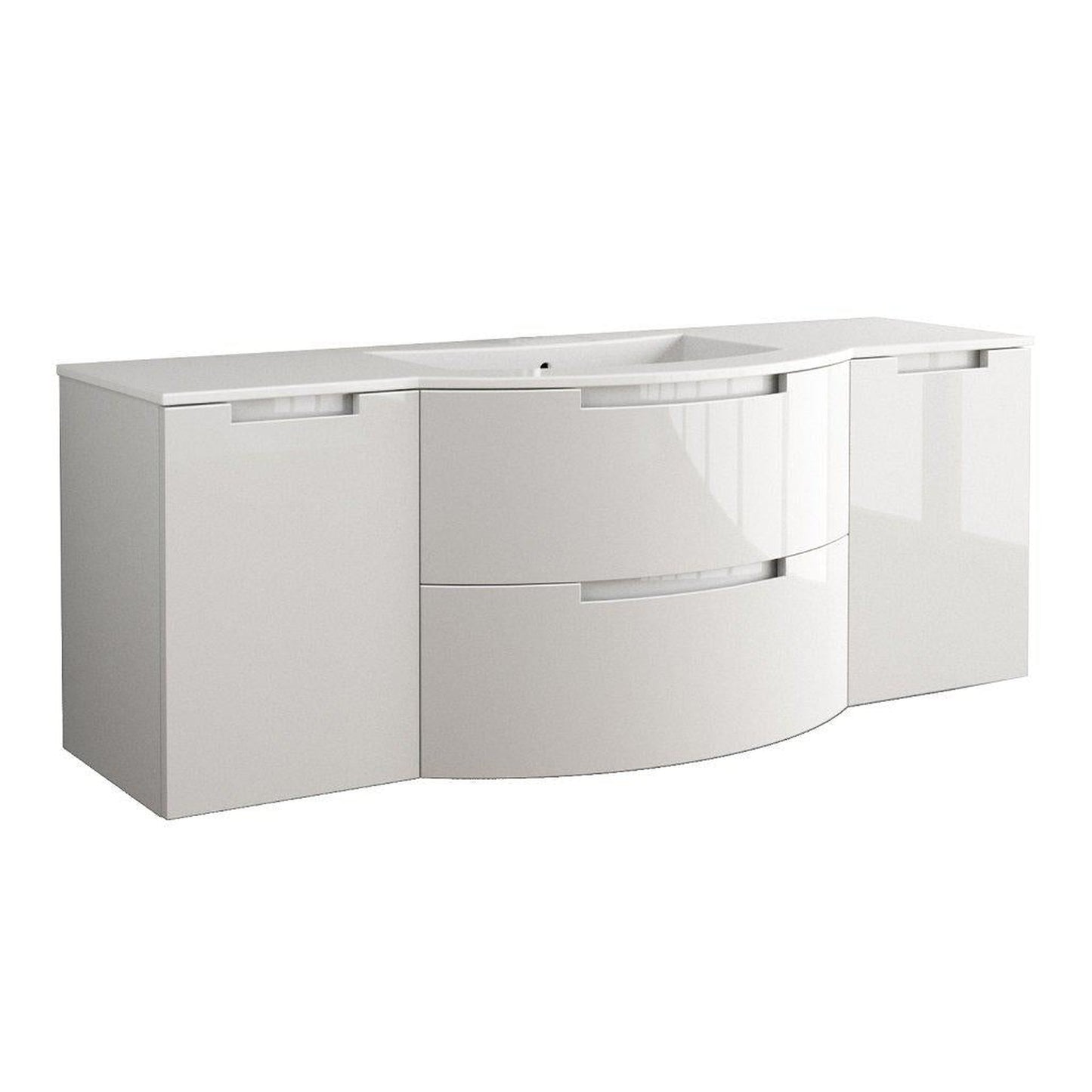 LaToscana Oasi 67" wall-mounted vanity set includes L036 vanity piece which has two soft-closing curved drawers, along with LV052 integrated washbasin in white Tekorlux with overflow. It also comes with OAB052S side cabinet with 1 left door and OAB052R side cabinet with 1 right door, both with soft-closing systems.