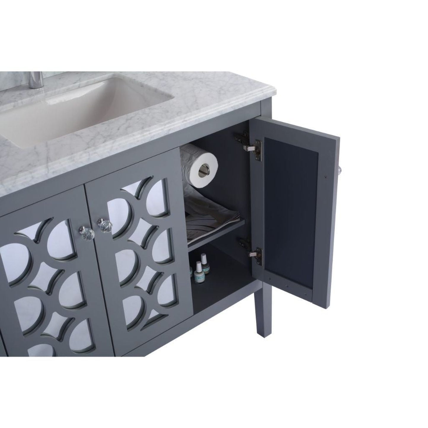 Presenting the Mediterraneo Collection, if you’re going for the “Putting on the Ritz” look, with a nod to classical vintage, this look brings its classic relevance to today’s bathrooms. The Mediterraneo vanity features a real wood cabinet with doors that showcase classical cut-outs, layered onto a mirrored glass background. As you reach for the crystal glass knobs on the cabinet's soft-closing doors, they open to an open bottom platform that contains a surprise hidden drawer with soft closing rails. Style and functionality have indeed married and produced this fantasy beauty, come to reality in two finishes: Grey and Classic White. Still seeking more storage? A coordinating tall side cabinet commands your attention and completes the ritzy elegant look.