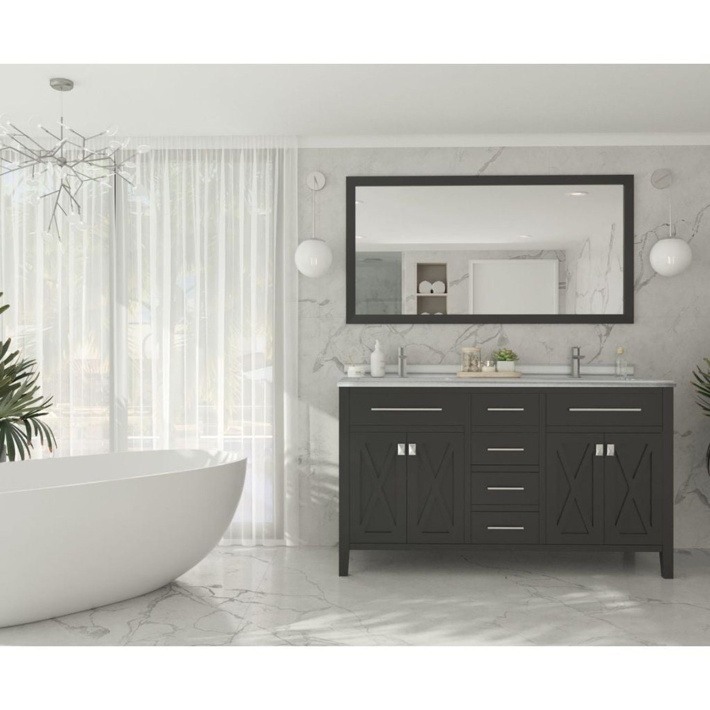 Laviva Wimbledon 60" Espresso Vanity Base and White Stripes Marble Countertop With Double Rectangular Ceramic Sinks