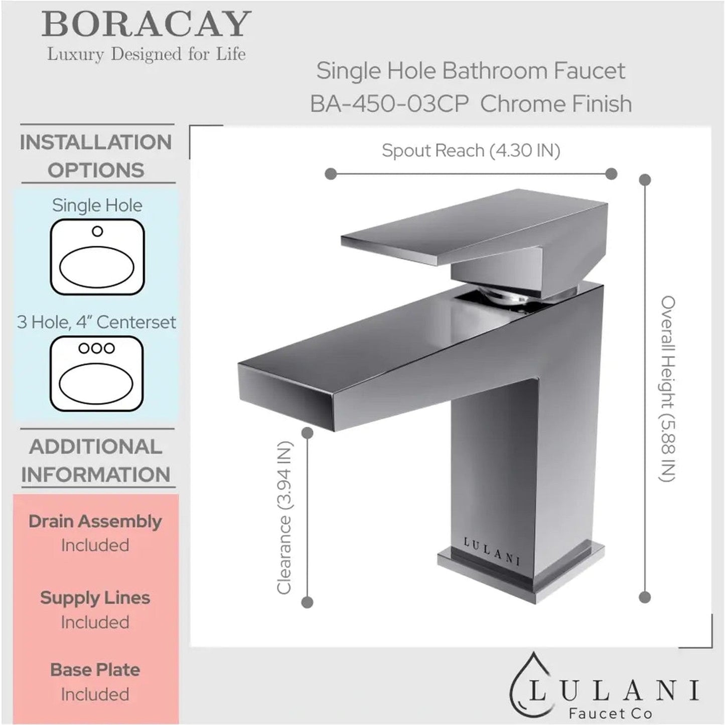 Boracay BA-450-03 is a single-handle bathroom faucet that suits any modern aesthetic. Named after the beautiful island of Boracay, this faucet promises to create a Zen bath retreat.