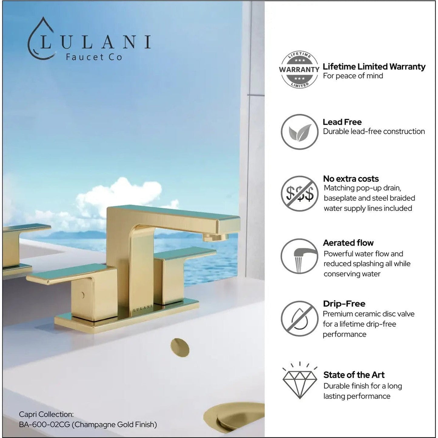 Whatever bathroom design you wish to achieve, the Capri BA-600-02 faucet can pull it off. This faucet is available in 4 color options: chrome, brushed nickel, champagne gold, and matte black.