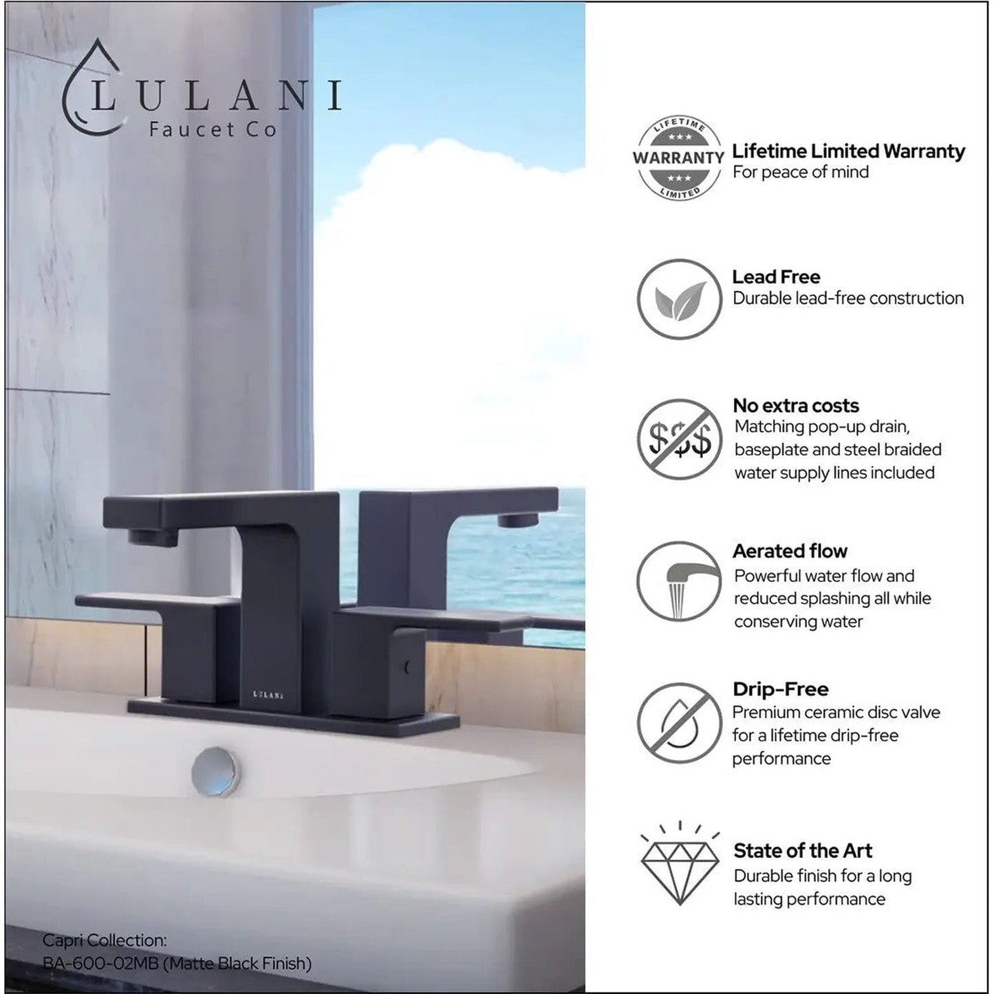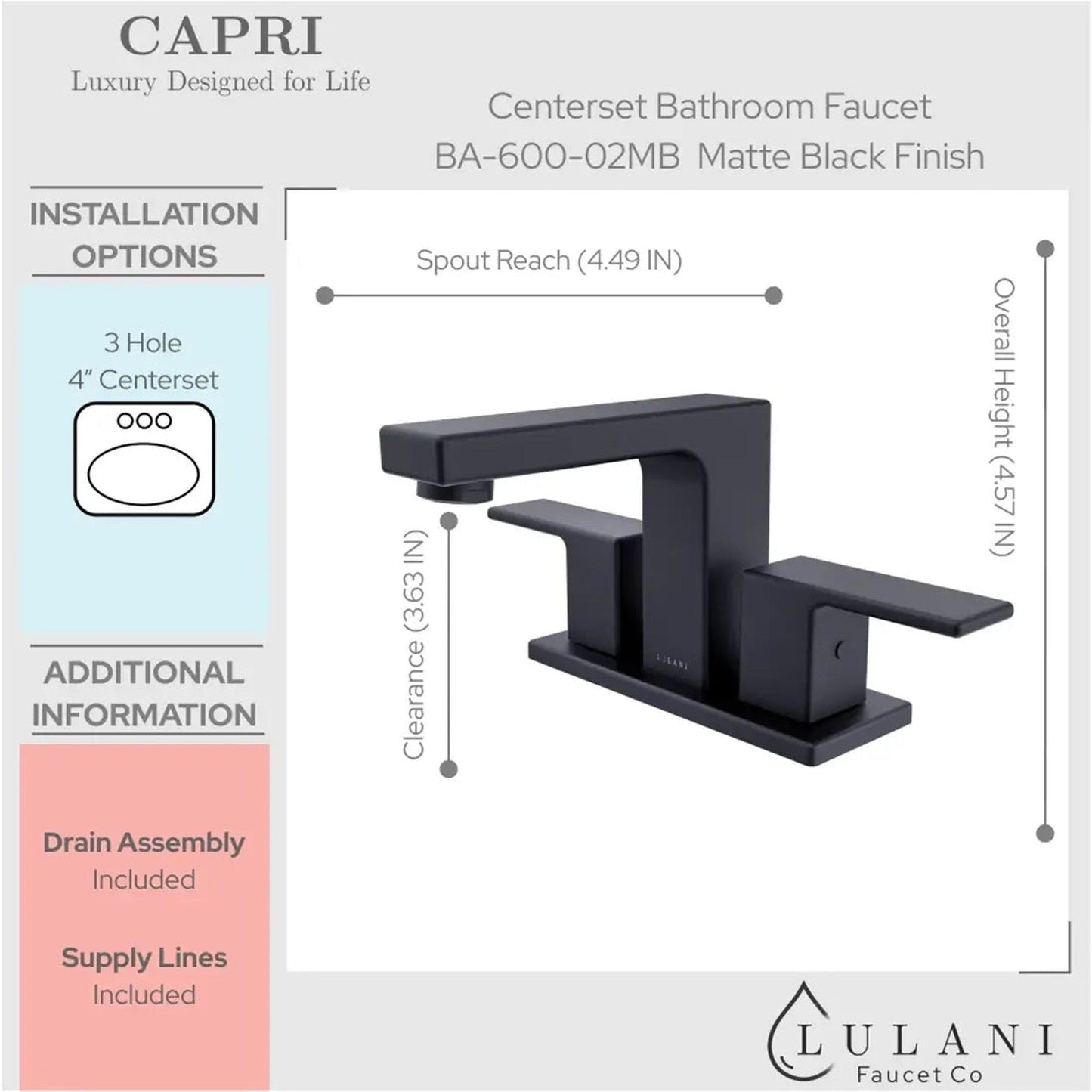 Lulani Capri Matte Black 1.2 GPM 2-Lever Handle 3-Hole Centerset Brass Faucet With Drain Assembly