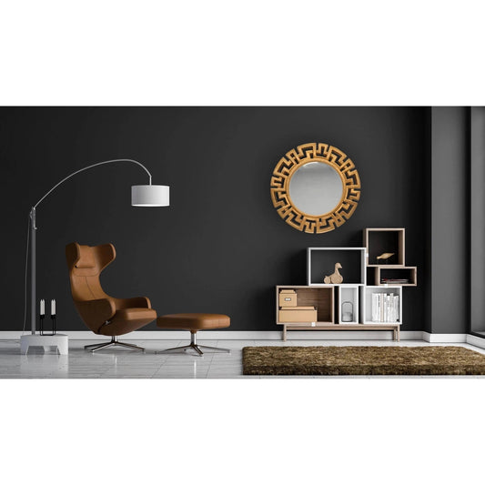 - Resin Frame Hand Finished in Bronze, Gold, or Champagne Silver - The round mirror and custom Greek Key style frame design in a bronze matte satin finish is a perfect accent to your contemporary, Mid Century modern, or transitional style.