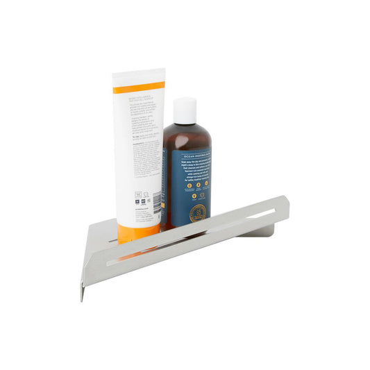 This aesthetic shower shelf is designed to fit the corner of a shower or wall. It features a sleek floating style design with standard drain slots that complements any bathroom décor. Crafted from durable, water-resistant #304 stainless steel, it is thoughtfully designed with a lipped edge to keep items secure. Custom sizes and finishes are available to meet your design specifications.