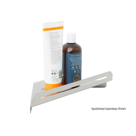 This aesthetic shower shelf is designed to fit the corner of a shower or wall. It features a sleek floating style design with standard drain slots that complements any bathroom décor. Crafted from durable, water-resistant #304 stainless steel, it is thoughtfully designed with a lipped edge to keep items secure. Custom sizes and finishes are available to meet your design specifications.