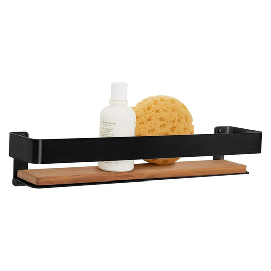 Seachrome Coronado 700 Series 18" x 4" Rectangular Shower Shelf With Rail in Matte Black Powder Coated Stainless Steel and Natural Teak Wood Insert