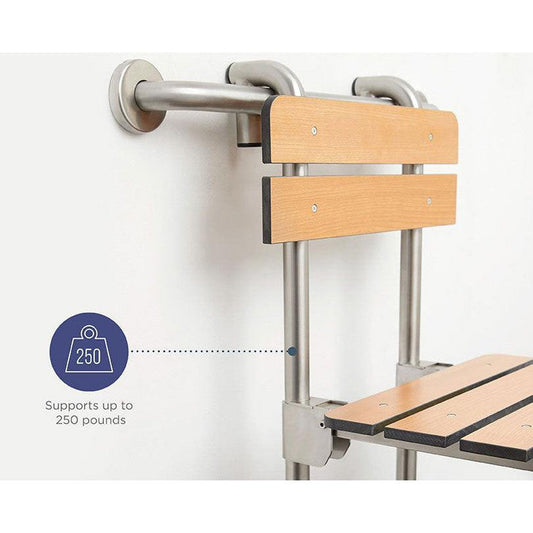 The versatile Profile Bench Seat is designed to offer secure support in walk-in showers only. The bench seat measures 18 in. L x 20.625 in. W x 31 in. H and includes an 18 in. grab bar (Model # GSS-180-QCR) for mounting the seat. Made from durable, water-resistant teak phenolic slats and #304 stainless steel frame, this bench seat supports up to 250 lbs. when properly installed and is ideal for long-lasting use. The Profile Bench Seats fold down to a slim profile to maximize space in the shower and include portable design features that allow the seat to be easily removed and stored when not in use.