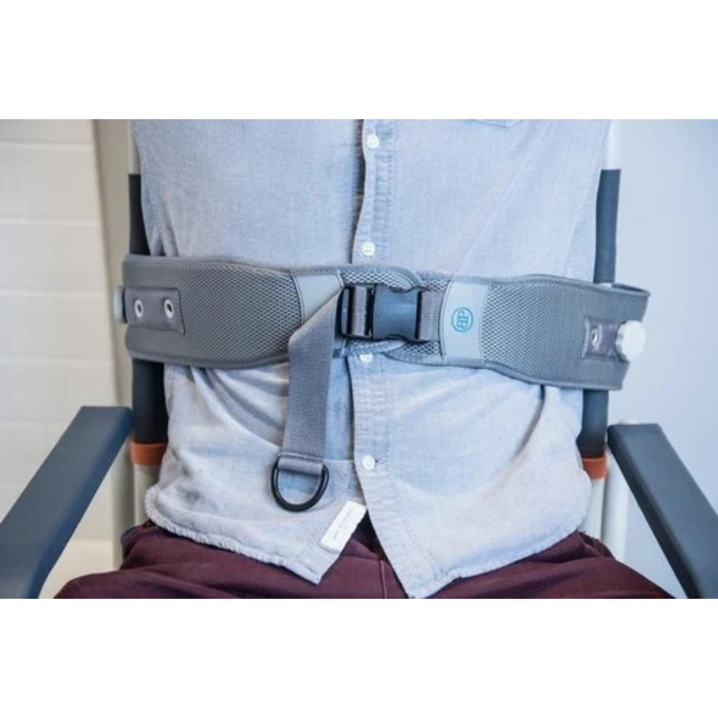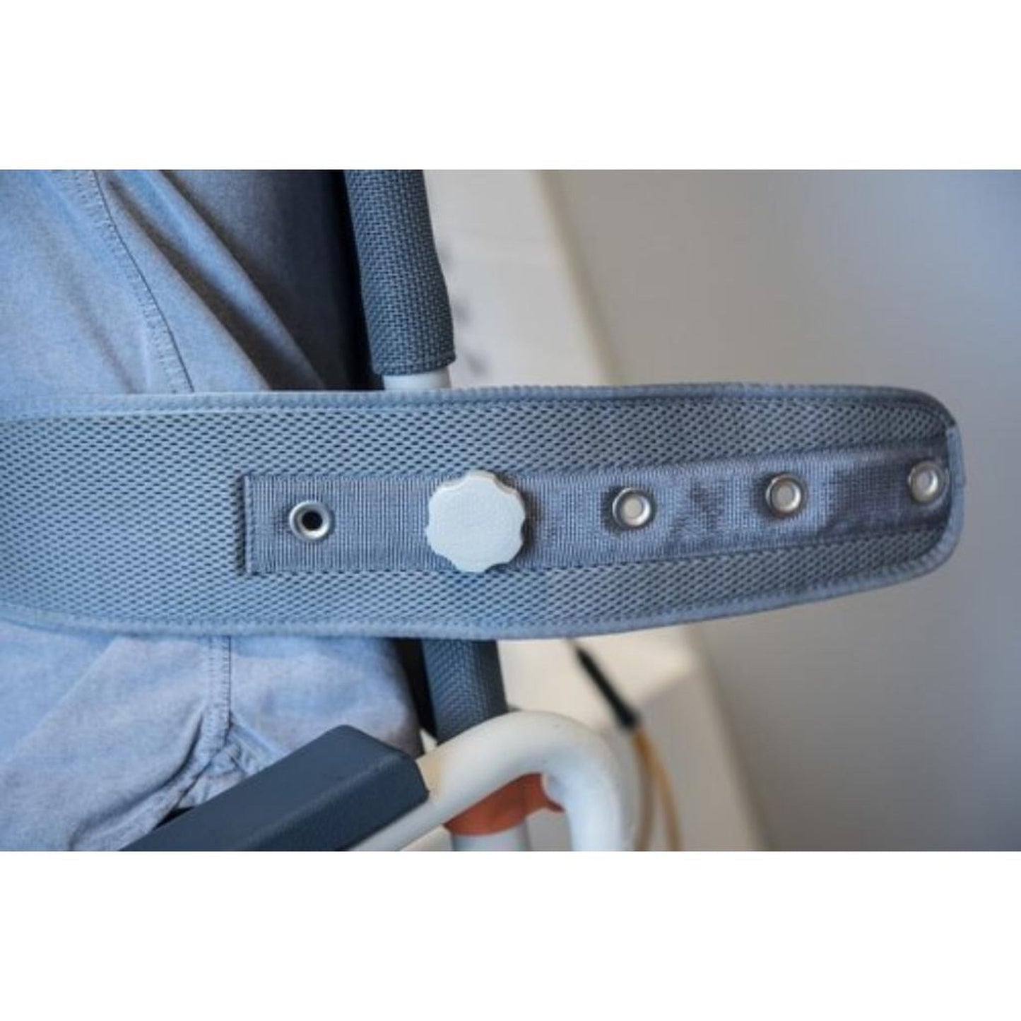 The flexible, padded belt can be used across the chest or abdomen to prevent forward or lateral falls. Additionally, fitting a Bodypoint lap belt across the knees or legs can prevent clients from slipping down out of the shower chair (For Information search "Bodypoint Lap Belt").