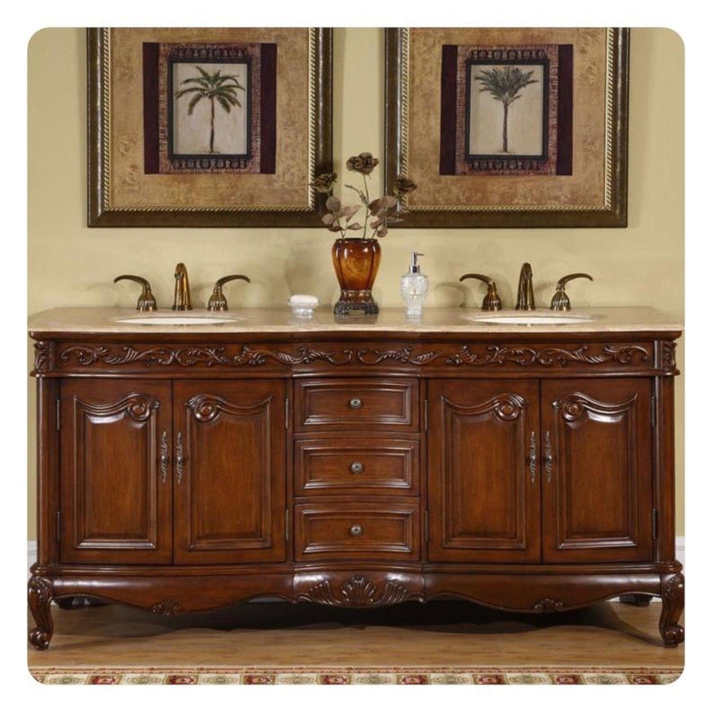 Silkroad Exclusive 72" Double Sink English Chestnut Bathroom Vanity With Travertine Countertop and Ivory Ceramic Undermount Sink