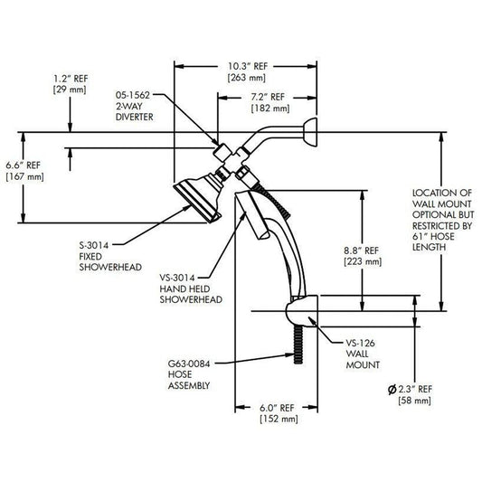 - Chrome plated brass 2-way pop-up diverter transfers water from the fixed mount shower spray to the hand shower.