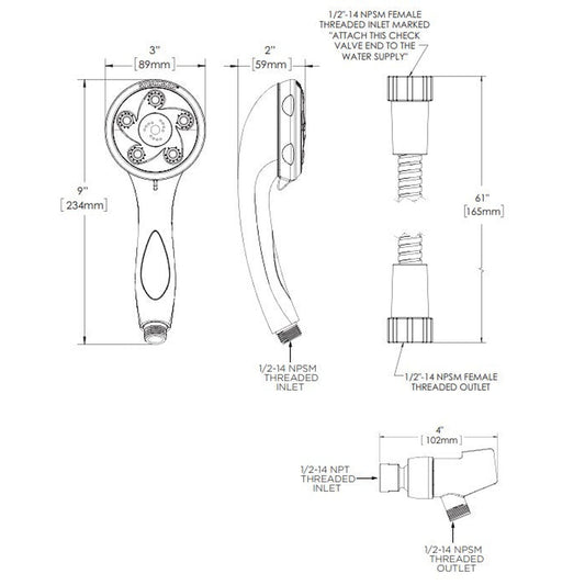 - Handheld shower has 1/2" -14 NSPM male inlet